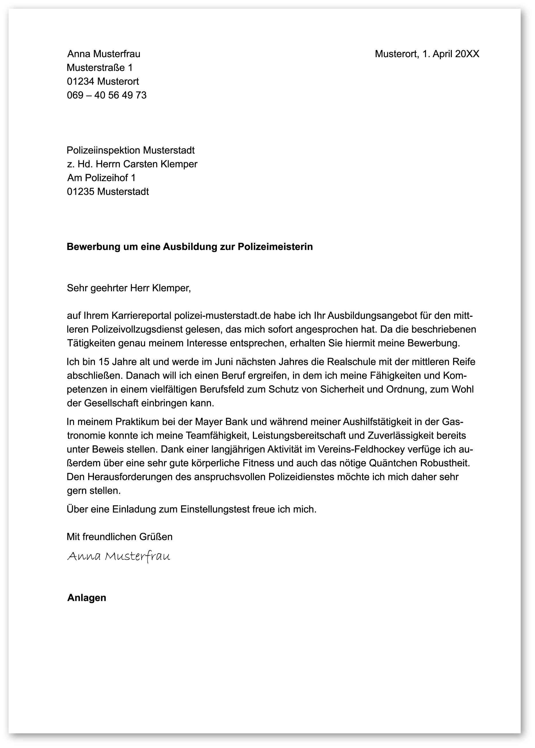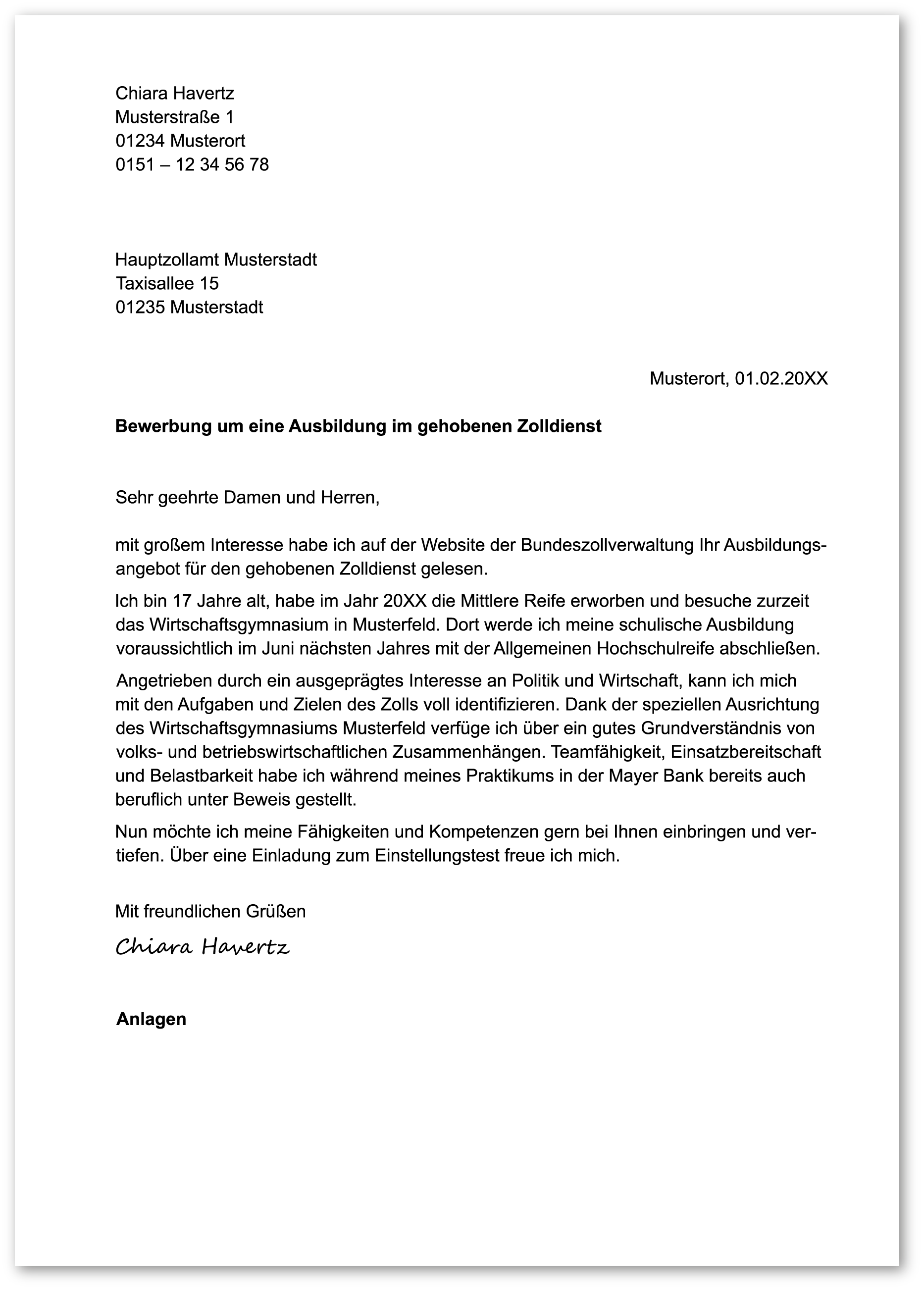 Stattdessen gibt es ein transparentes bewerbungsverfahren das schritt für schritt erklärt wird. Wenn ein problem oder besonders komplizierte fälle gibt greifst du selber ein und unterstützt deine kollegen bei der lösung. Wen wundert s winkt dir doch neben einem ansprechenden gehalt auch noch eine hohe soziale absicherung als beamter. Diese bewerbung um eine ausbildung wurde von einem unserer besucher veröffentlicht.