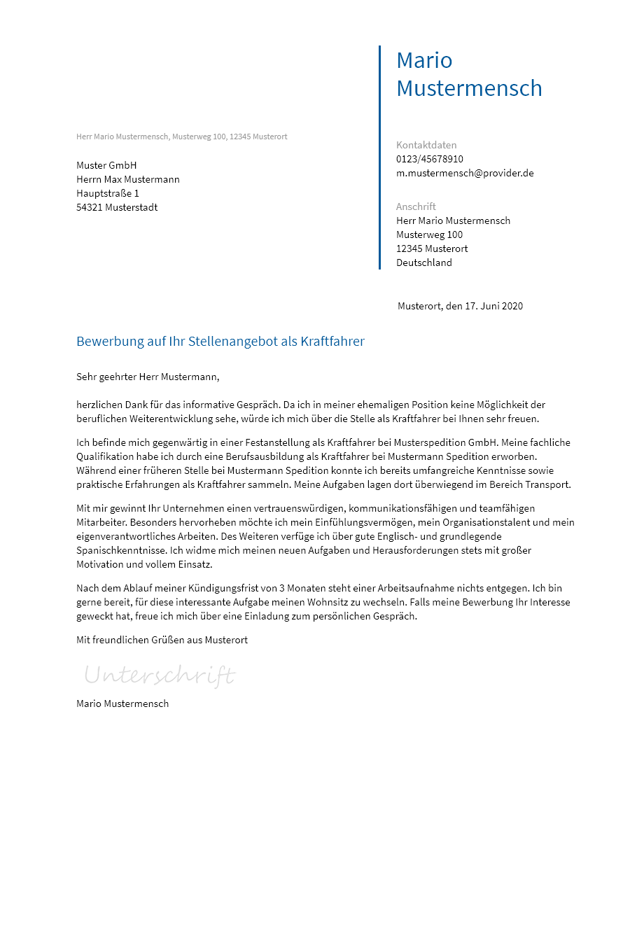 Sehr geehrter herr muster mit großem interesse habe ich auf den internetseiten ihres unternehmens gelesen dass sie kraftfahrer mit berufserfahrung suchen. Die bewerbung steht kostenlos zum download zur verfügung. Außerdem erfährst du. Diese muster dienen der orientierung für ihre bewerbung im bereich der spedition deswegen sollten sie diese nicht direkt übernehmen sondern umschreiben.
