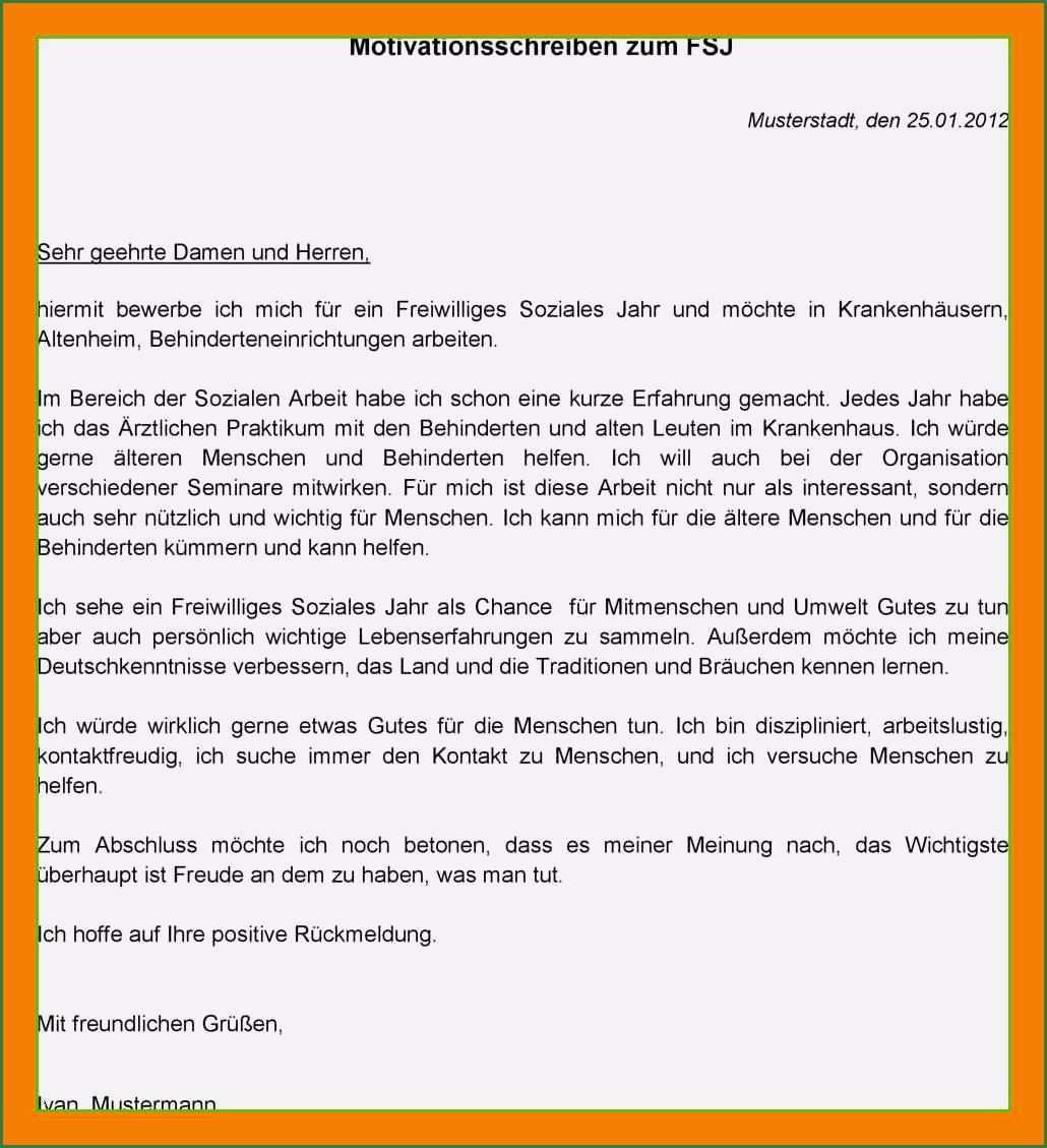 Dabei sollen sie ihre motivation und beweggründe deutlich machen und so individuell offen und ehrlich wie möglich sein. Sehr geehrter herr geehrte frau xxx name des ansprechpartners ich bewerbe mich bei ihnen um eine stelle für das freiwillige soziale jahr. Sehr geehrter herr müller ich habe im juni 2013 die schulausbildung mit der allgemeinen hochschulreife erfolgreich abgeschlossen und bewerbe mich nun um ein freiwilliges soziales jahr fsj in ihrem klinikum. Das anschreiben oder die anfrage für das soziale jahr wird in form eines motivationsschreibens formuliert.