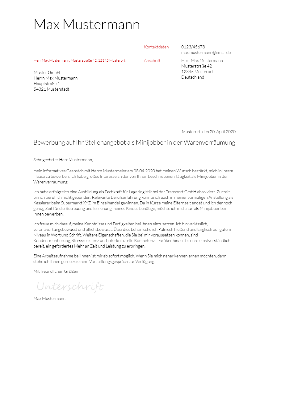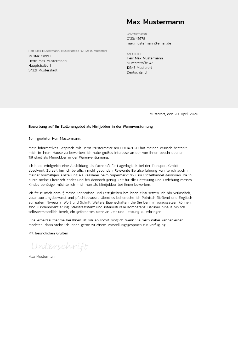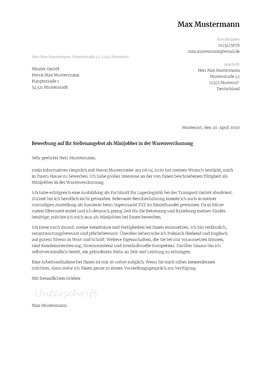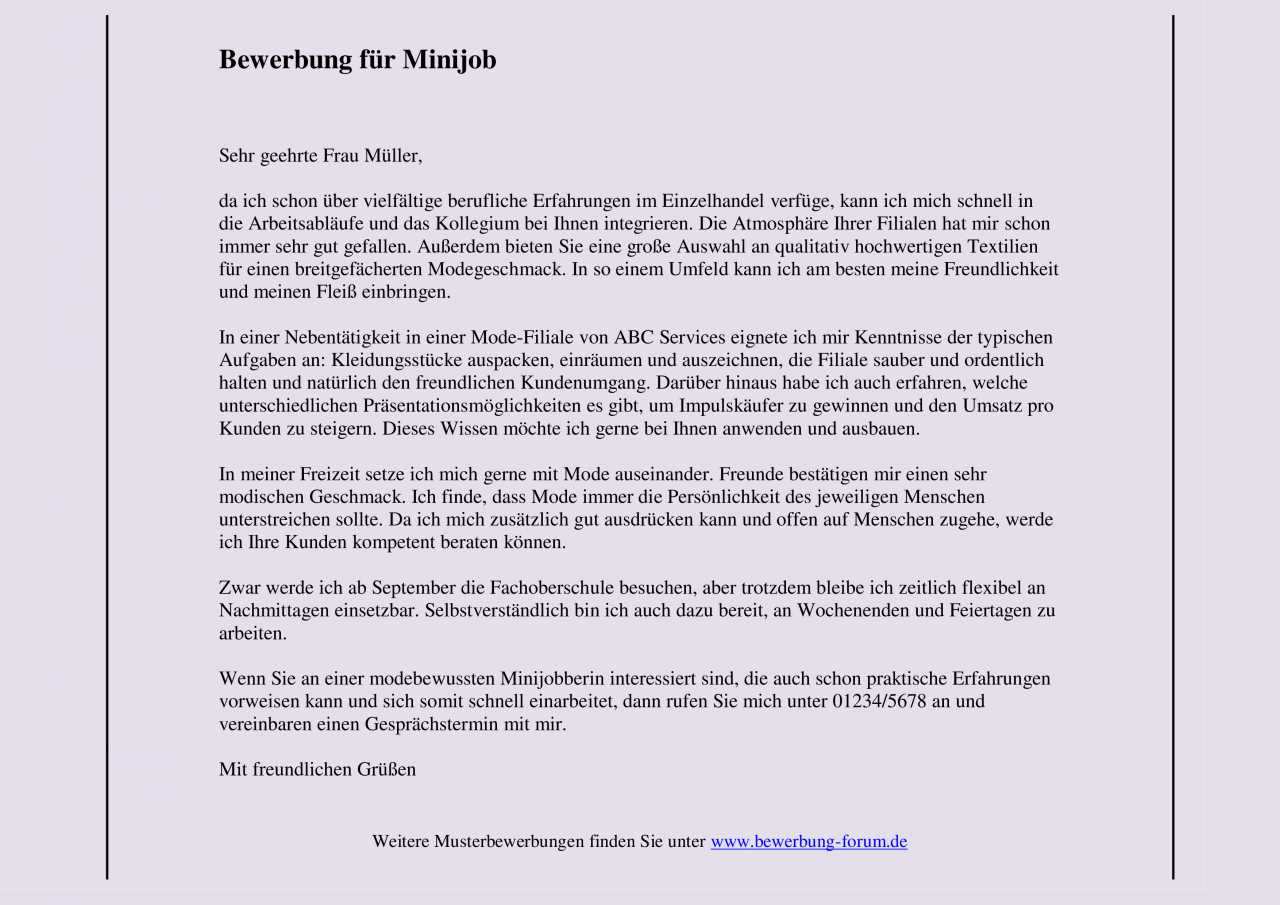 Nutzen sie diese vorlage als muster. Auch bei einer bewerbung auf einen minijob gibt es einige formale vorgaben an die sich bewerber halten sollten. Die muster dokumente wurden speziell für diesen beruf erstellt. Sie verdienen sich mit einem minijob etwas dazu als servicemitarbeiter in der gastronomie nachhilfelehrer bürokraft oder in anderen aushilfsjobs.