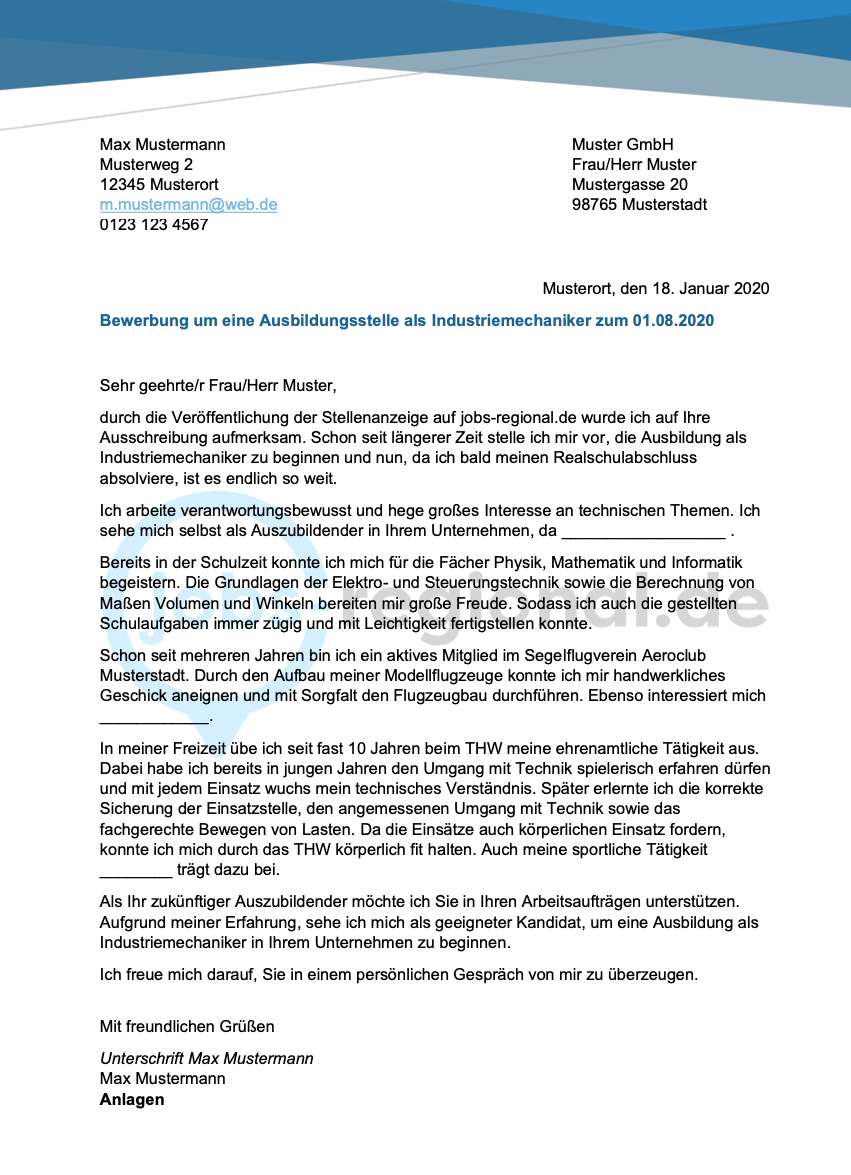 Nutze die vorlage um dich inspirieren zu lassen. Im folgenden siehst du ein muster für ein bewerbungsschreiben als industriemechaniker in. Informieren sie sich vorab über das unternehmen damit sie passgenau ihre bewerbung darauf abstimmen können.