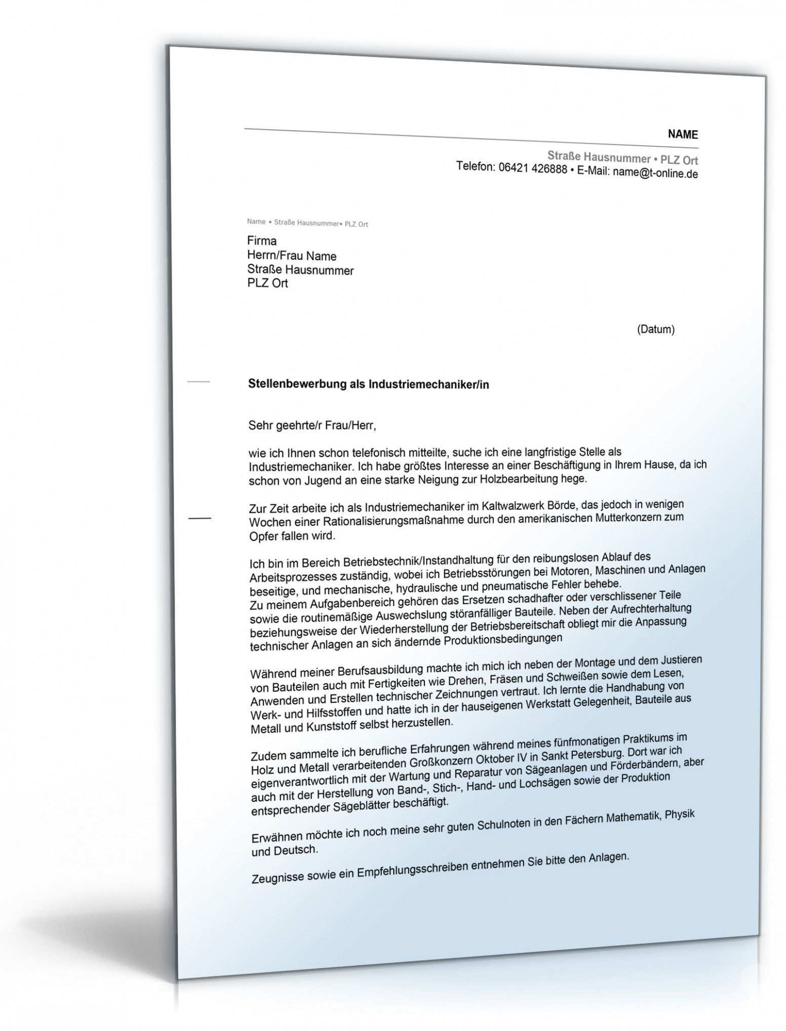 In diesem beruf werden handwerkliche allrounder ausgebildet die vielfältige technische aufgaben rund um maschinen und produktionsanlagen übernehmen. Lade dir kostenlos das anschreiben den lebenslauf und das deckblatt für deine bewerbung als industriemechaniker herunter. Neben den erforderlichen fähigkeiten ist eine gute recherche die halbe miete. Alle unsere vorlagen können kostenlos heruntergeladen und als hilfe und inspiration für deine bewerbung verwendet werden.