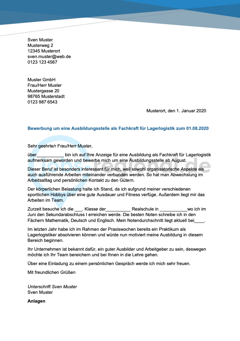 Im folgenden siehst du ein muster für ein bewerbungsschreiben als fachkraft für lagerlogistik. Um diese ausbildungsstelle bewerbe ich mich.