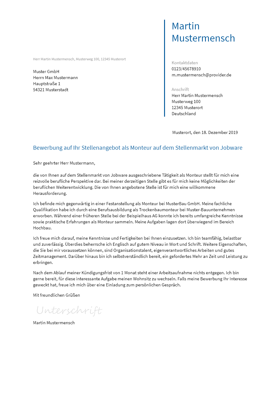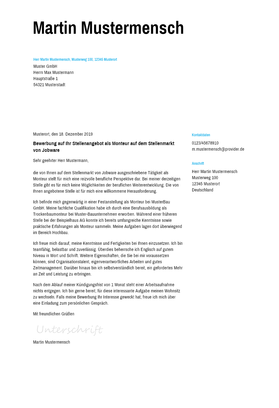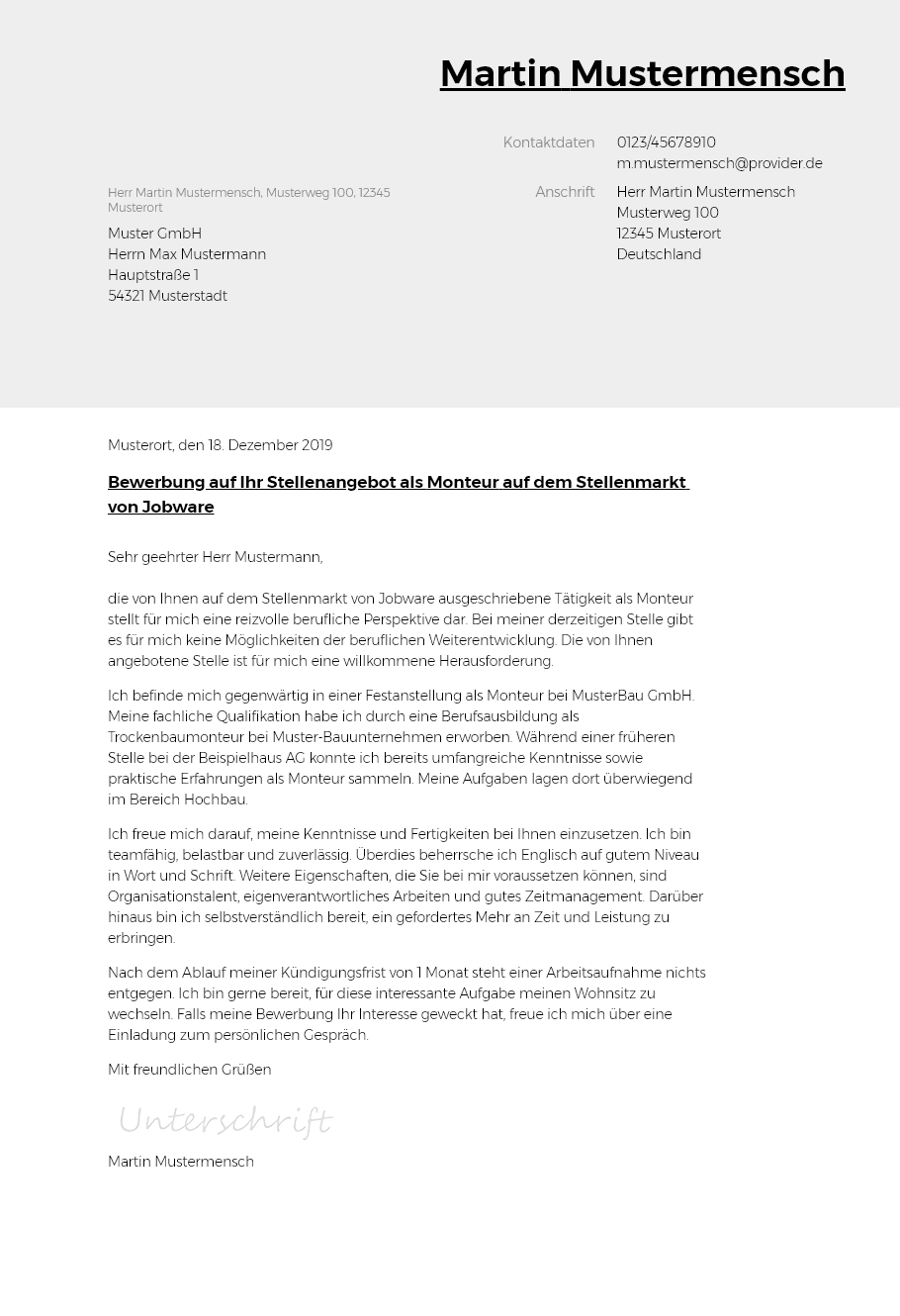 Bewerbung monteur vorlage. Sehr geehrter herr muster durch ihre stellenanzeige auf den internetseiten ihres unternehmens erfuhr ich dass sie zusätzliche monteure im außendienst für die region norddeutschland suchen. Bewerben sie sich auf ganz unkompliziert weise von überall und direkt auf die für sie interessanten stellenangebote. Lade dir kostenlos das anschreiben den lebenslauf und das deckblatt für deine bewerbung als monteur herunter. Muster bewerbung als monteur.