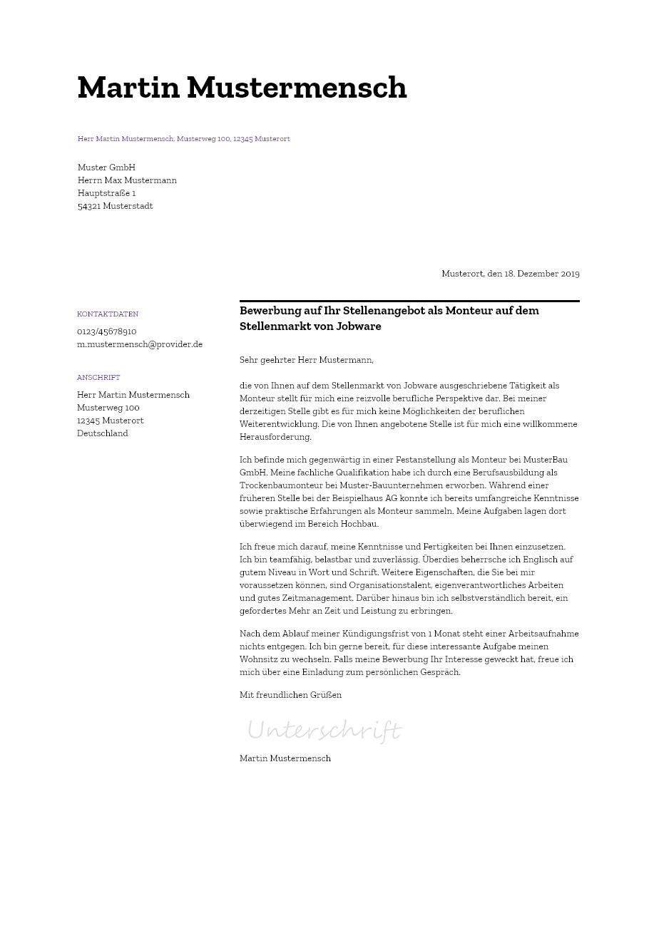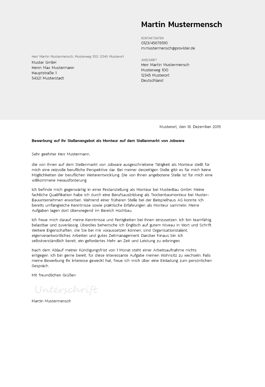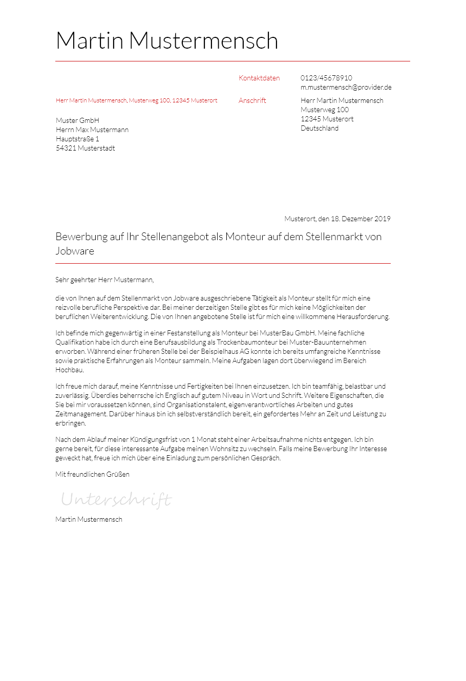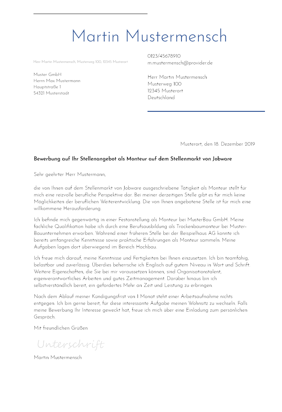 Bewerbung monteur vorlage. Sehr geehrter herr muster durch ihre stellenanzeige auf den internetseiten ihres unternehmens erfuhr ich dass sie zusätzliche monteure im außendienst für die region norddeutschland suchen. Bewerben sie sich auf ganz unkompliziert weise von überall und direkt auf die für sie interessanten stellenangebote. Lade dir kostenlos das anschreiben den lebenslauf und das deckblatt für deine bewerbung als monteur herunter. Muster bewerbung als monteur.