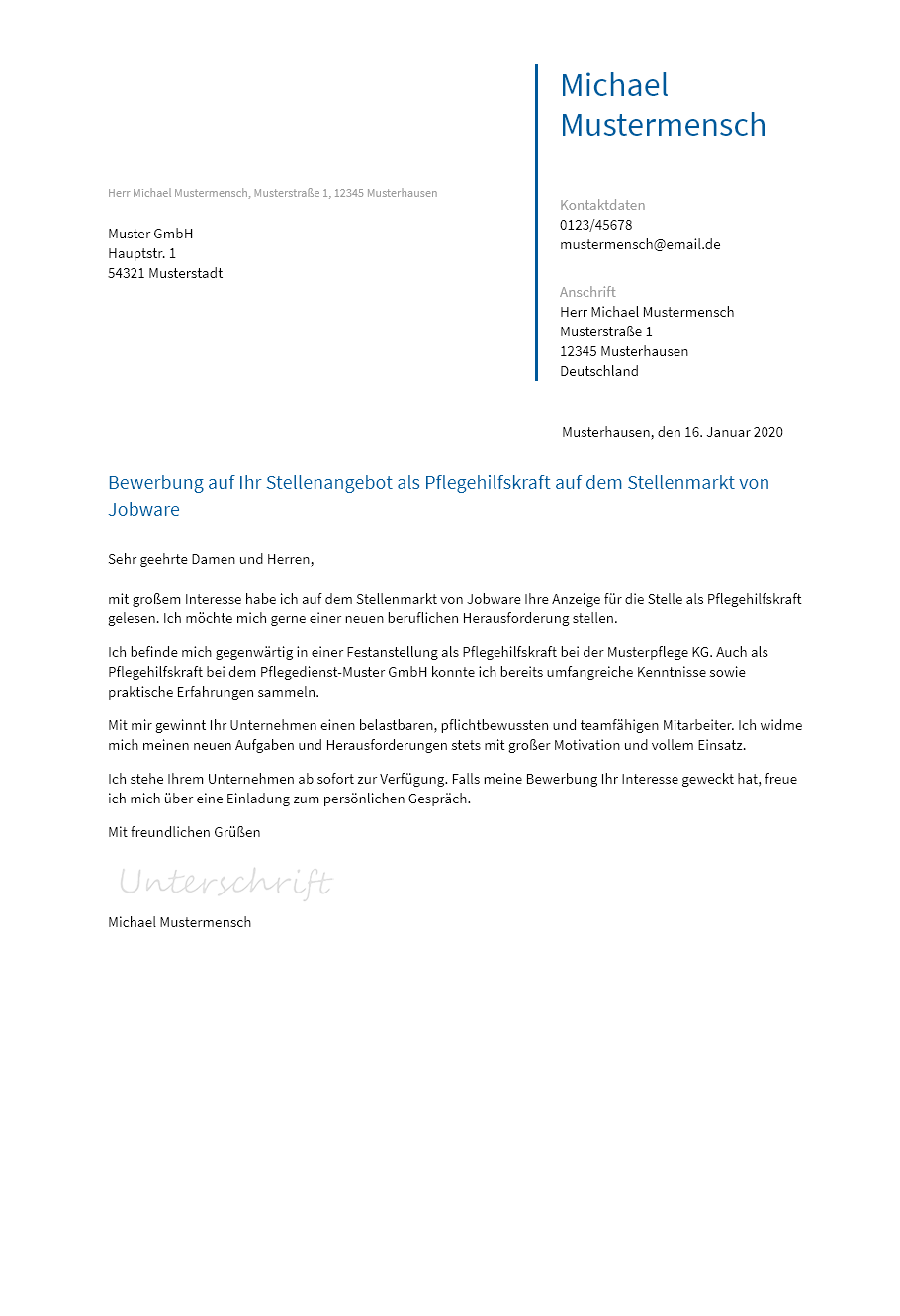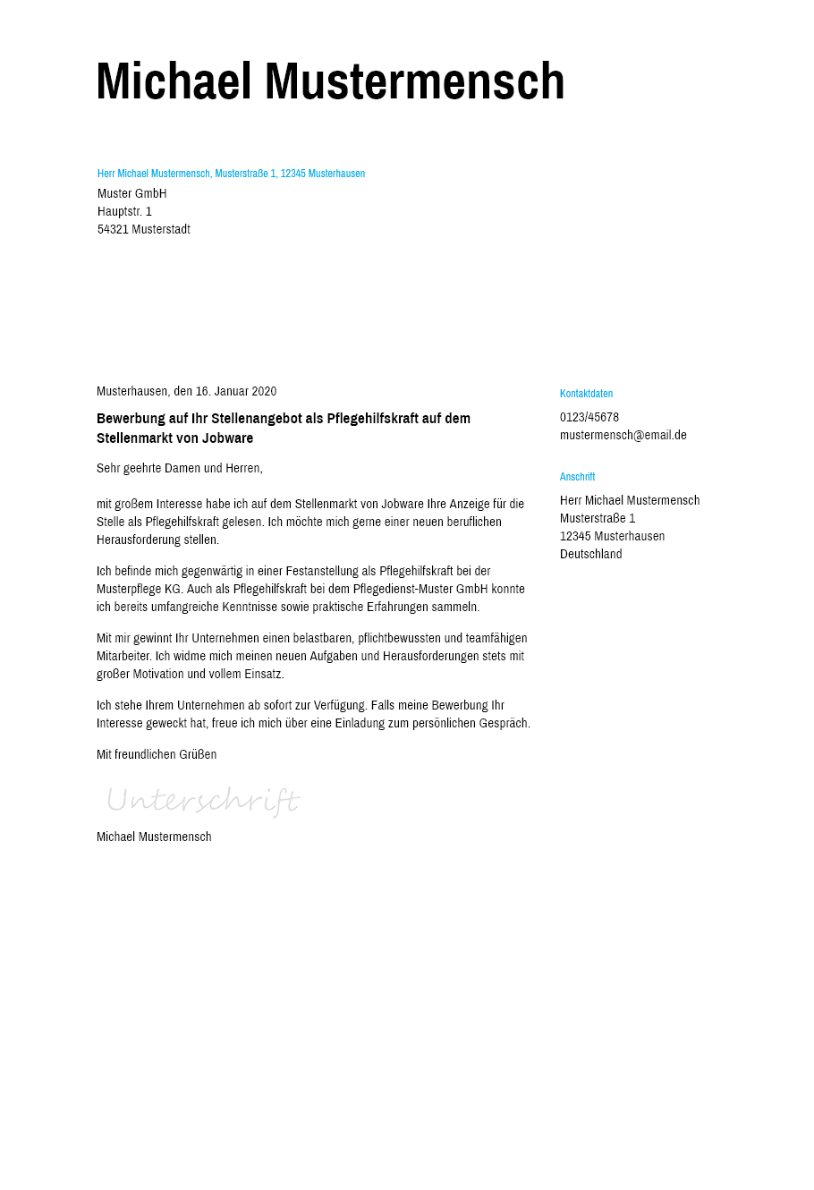 Bewerbung pflegehilfskraft quereinsteiger muster. Lassen sie sich von unseren beispielen für erfolgreiche bewerbungen von quereinsteigern motivieren. Muster und vorlagen für eine perfekte bewerbung als altenpflegehelfer wir stellen ihnen kostenlos unsere muster und bewerbungsvorlagen in verschiedenen designs zur verfügung damit sie ihre bewerbung möglichst schnell und einfach aber auch professionell gestalten können. Dieses muster bewerbungsschreiben als pflegehelfer in ist wie alle anderen muster bewerbungsvorlagen nur als beispiel gedacht. Unser team begrüßt sie als leser hier.