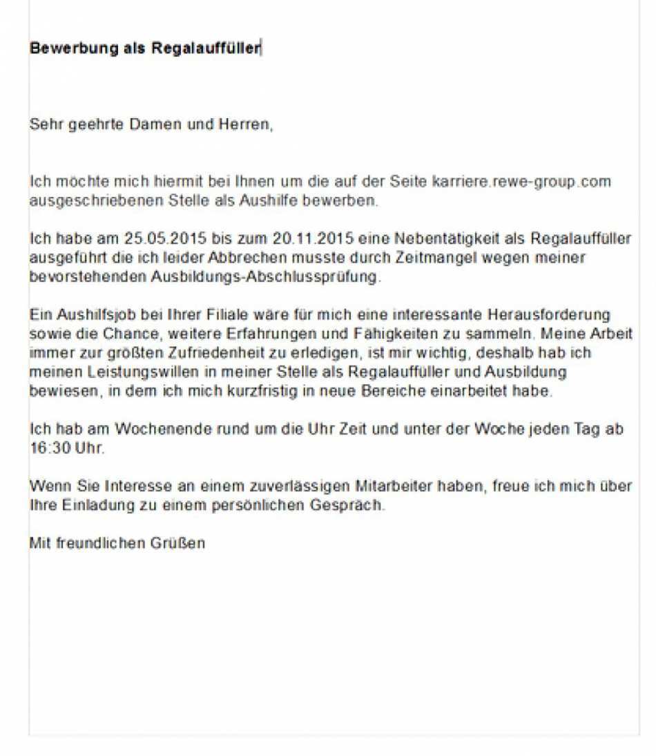 Ein bewerbungsschreiben ist in der regel nicht länger als 1 a4. Lade dir kostenlos das anschreiben den lebenslauf und das deckblatt für deine bewerbung als regalauffüller in herunter. Sehr geehrter herr muster durch eine bekannte die bereits für sie tätig ist habe ich erfahr dass sie weitere stellen an regalauffüller vergeben. Bewerbungsschreiben regalauffüller muster für supermarkt beitrag von typisch ich 10 03 2009 17 51 bitte um korrekturlesung und verbesserungsvorschläge.
