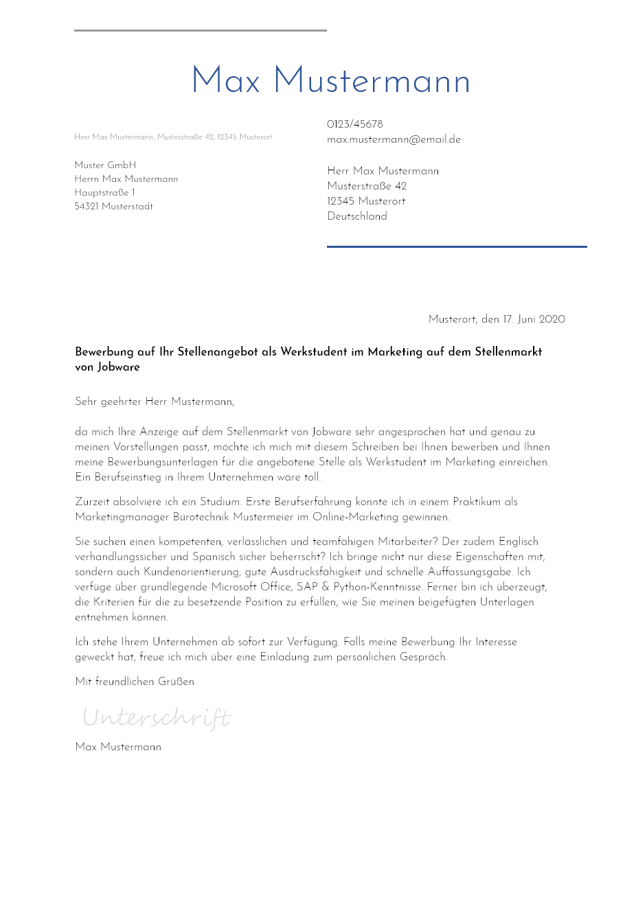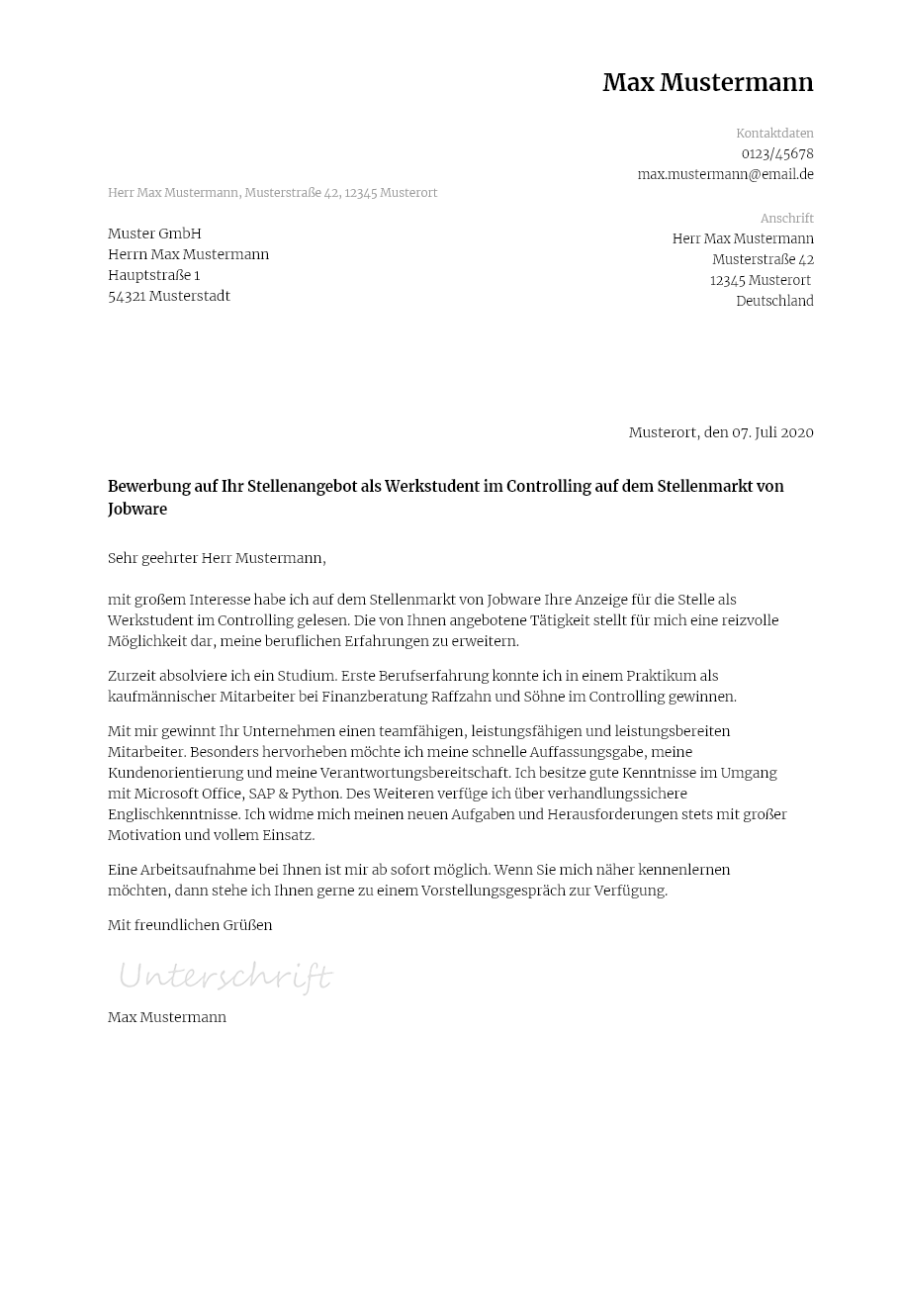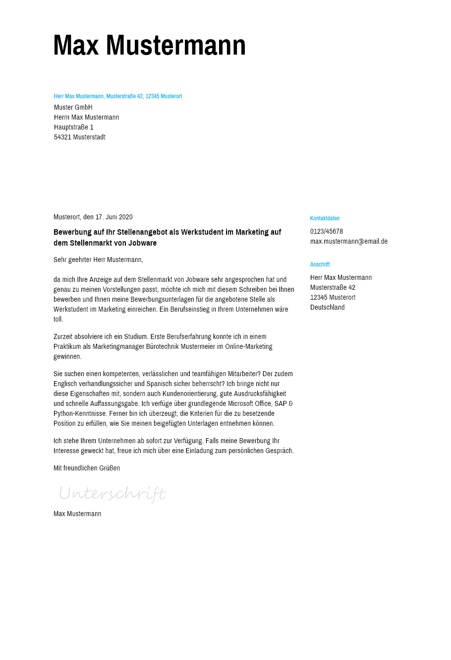 Falls sie beim formulieren des anschreibens noch schwierigkeiten haben können ihnen sicher unsere kostenlosen vorlagen und mustertexte weiterhelfen. Um ihnen das schreiben einer initiativbewerbung zu erleichtern können sie auch das folgende muster nutzen und online im web browser editieren. Hier findest du ein beispiel wie ein bewerbungsanschreiben für ein studentenjob mit bezug auf die konkrete stellenausschreibung aussehen könnte. Für deine bewerbung als werkstudent ist eine fehlerfreie bewerbung mit einem aussagekräftigen anschreiben und stimmigen lebenslauf entscheidend deine bewerbung als werkstudent dient vor allem dazu dich von mitbewerbern abzugrenzen und dem personaler deines traumunternehmens zu zeigen dass du der perfekte kandidat für die gewünschte stelle bist.
