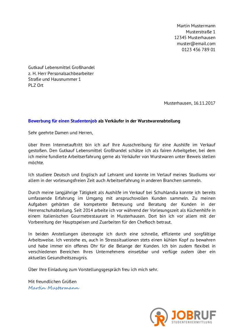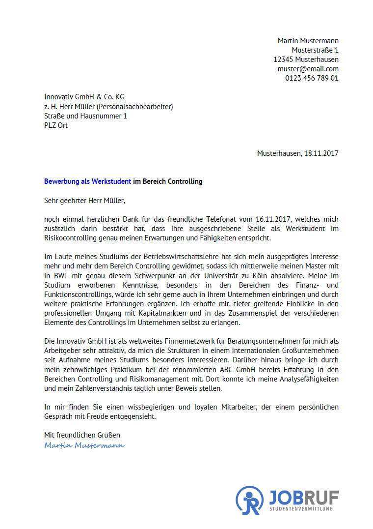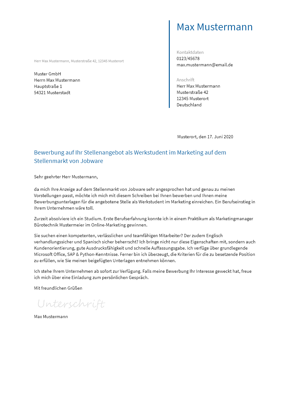 Falls sie beim formulieren des anschreibens noch schwierigkeiten haben können ihnen sicher unsere kostenlosen vorlagen und mustertexte weiterhelfen. Um ihnen das schreiben einer initiativbewerbung zu erleichtern können sie auch das folgende muster nutzen und online im web browser editieren. Hier findest du ein beispiel wie ein bewerbungsanschreiben für ein studentenjob mit bezug auf die konkrete stellenausschreibung aussehen könnte. Für deine bewerbung als werkstudent ist eine fehlerfreie bewerbung mit einem aussagekräftigen anschreiben und stimmigen lebenslauf entscheidend deine bewerbung als werkstudent dient vor allem dazu dich von mitbewerbern abzugrenzen und dem personaler deines traumunternehmens zu zeigen dass du der perfekte kandidat für die gewünschte stelle bist.