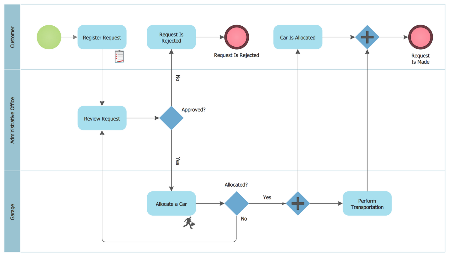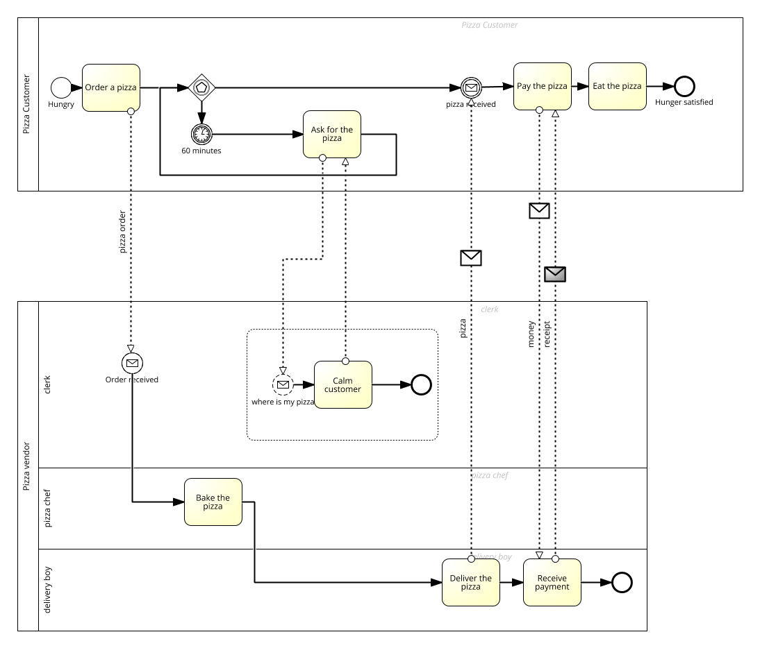 Bpmn 2 0 beispiel. This is always followed by an intermediate event or a message receiving task. A process engine should ensure that both approvals are fulfilled before the request is approved. For a request e g a payment two approvals of two different people are needed. Data objects sequence flows associations groups message flows gateways and intermediate events.