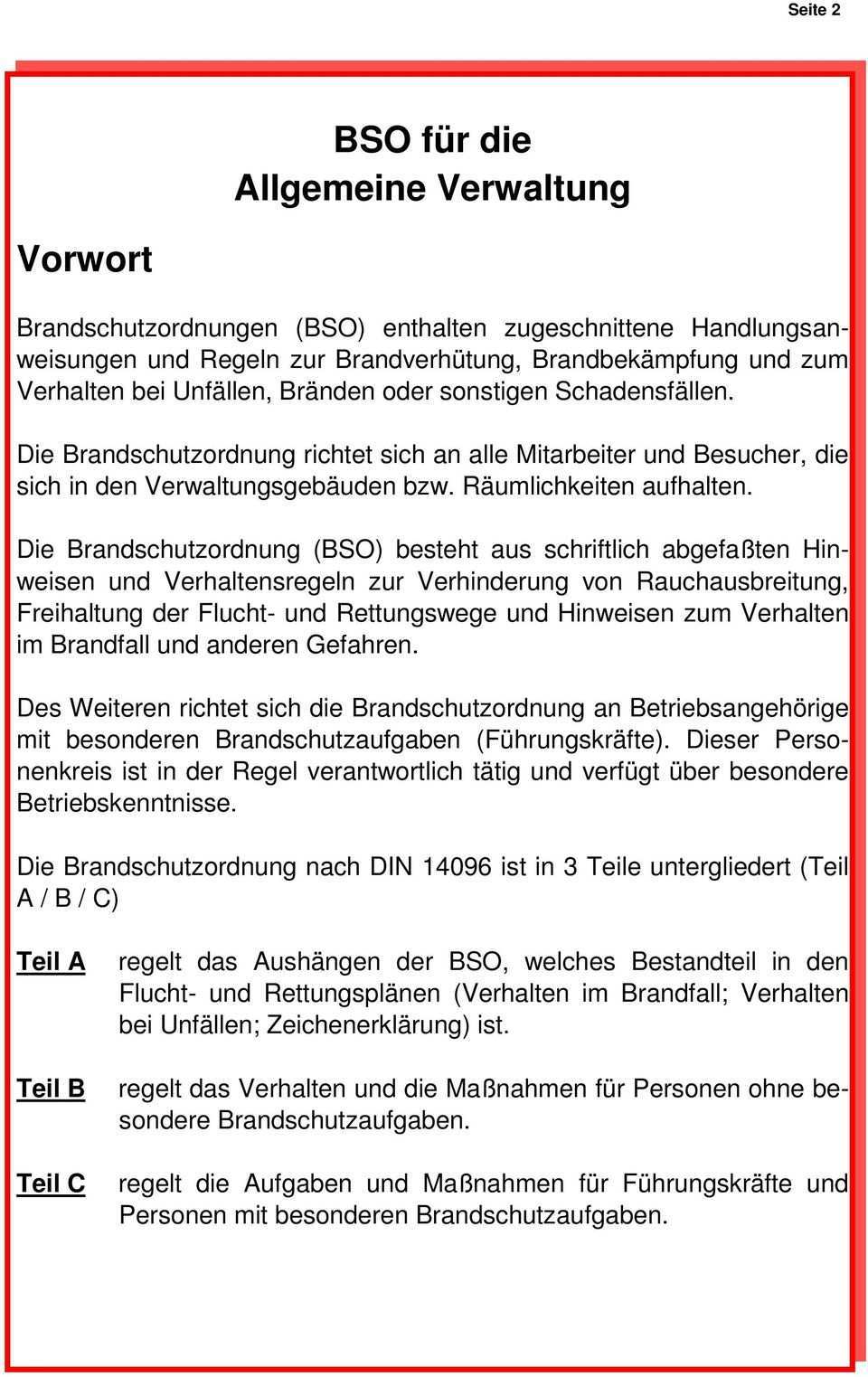 Teil c regelt die durchführung vorbeugender brandschutztechnischer maßnahmen und weist diese den verantwortlichen personen zu. In diesem teil sind die wichtigsten verhaltensregeln in schriftlicher form mitzuteilen. Einhaltung der brandschutzbestimmungen im laufenden betrieb bei nutzungsänderungen. Gemäß din 14096 bestehen brandschutzordnungen aus bis zu drei teilen.