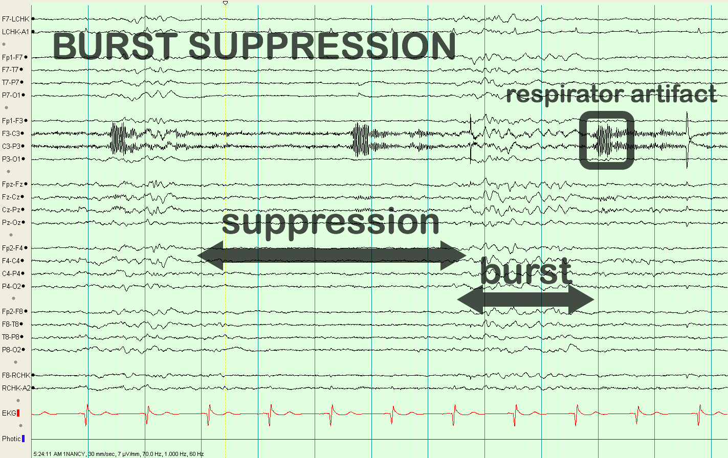 High voltage bursts of slow sharp and spiking activity alternating with a suppressed background have been termed burst suppression see image below. Such as overdose of general anesthesia. Burst suppression im intensiv eeg ist meistens medikamentös bedingt kann aber auch folge einer hypoxie sein. Dieses pathologische muster geht meist irreversibel dem hirntod vorher kann aber auch medikamenteninduziert sein oder durch hypothermie ausgelöst.