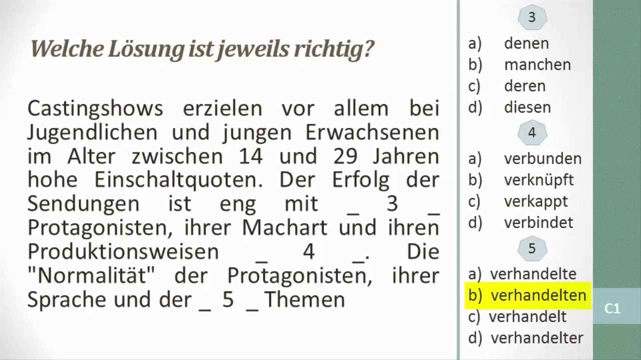 Zur vorbereitung auf das goethe zertifikat c1 finden sie hier übungsmaterialien zum hören lesen schreiben und sprechen. Das goethe c1 und goethe c2 zertifikat oder gds genannt ist ein in den meisten ländern breit anerkanntes deutsch diplom des goethe instituts in zusammenarbeit mit dem deutschen auswärtigen amt. Einer 10 minütigen einzel prüfung prüfungsteil sprechen. Telc deutsch c1 übungstest 1 schriftliche prüfung leseverstehen teil 1 lesen sie den folgenden text.