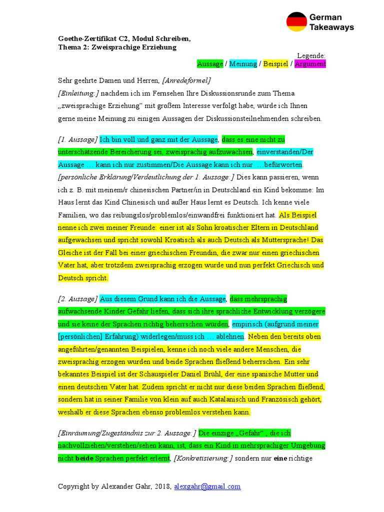 Aussage meinung beispiel argument sehr geehrte damen und herren anredeformel einleitung nachdem ich im fernsehen ihre diskussionsrunde zum thema zweisprachige erziehung mit großem interesse verfolgt habe würde ich ihnen gerne meine meinung zu einigen aussagen der diskussionsteilnehmenden. übungstest mit aufgaben zum hörverstehen leseverstehen schreiben und sprechen. Maiwald erfährt man dass menschen unterschiedlich intelligent sind weil die gehirnregionen die informationen unterschiedlich schnell verarbeiten. Goethe zertifikat c2 modul schreiben thema 2.