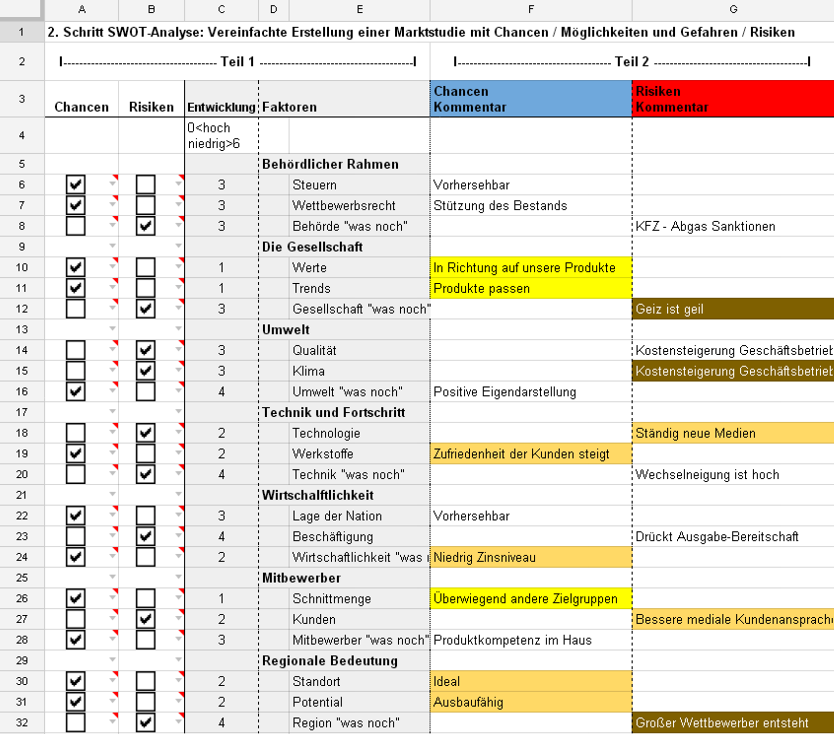 Denn wo risiken sind da gibt es auch chancen. Strengths stärken weakness schwächen oppurtunities chancen und threats risiken. Geringe risiken in unserem beispiel die mit einem wert 4 akzeptieren sie automatisch. Es besteht die möglichkeit auf ein trend für mein produkt.