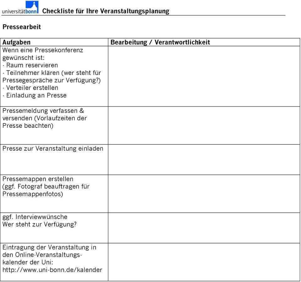 Ob sie nun bei ihrer arbeit ein gruppenprojekt managen eine veranstaltung planen oder ihre täglichen routineaufgaben organisieren eine detaillierte aufgabenliste hilft ihnen dass alles glatt und erfolgreich abläuft kostenlose word excel und pdf vorlagen für aufgaben und checklisten wie aufgabenlisten to do listen und vorlagen für unternehmen und den privatgebrauch. Werden sie als muster und checkliste verwendet reduziert dies kurzfristige änderungen und sorgt für eine noch reibungslosere durchführung der veranstaltung vor ort. Checkliste allgemeines zur veranstaltung. Je nach art der veranstaltung gibt es verschiedene mög lichkeiten eine veranstaltung zu verbreiten.
