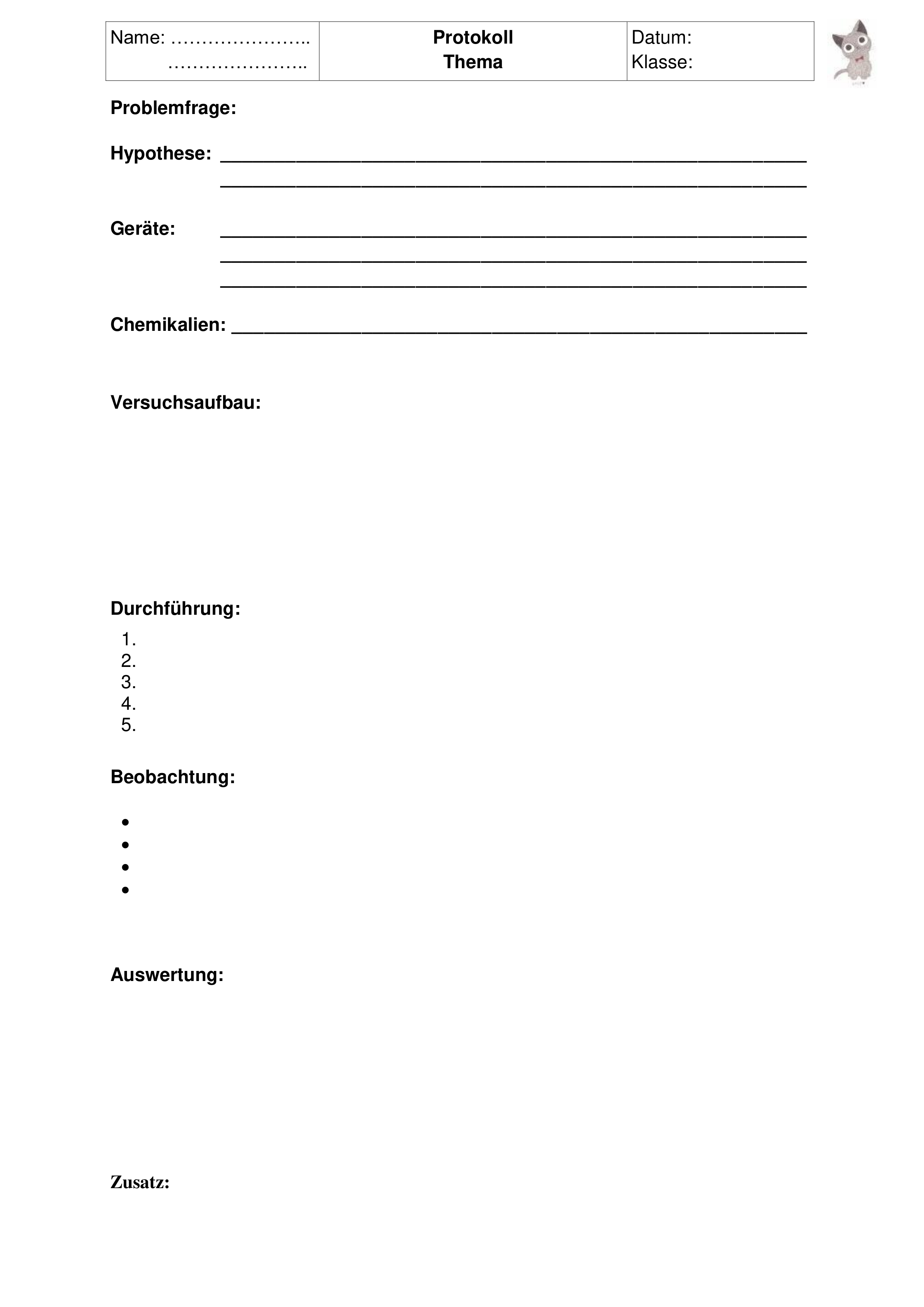 Wenn ihr auch protokolle habt dann schickt sie uns einfach zu. Muster eines versuchsprotokolls für die unterstufe. Es ist immer gleich aufgebaut. Um später den verlauf eines versuchs genau nachvollziehen zu können muss er exakt protokolliert werden.