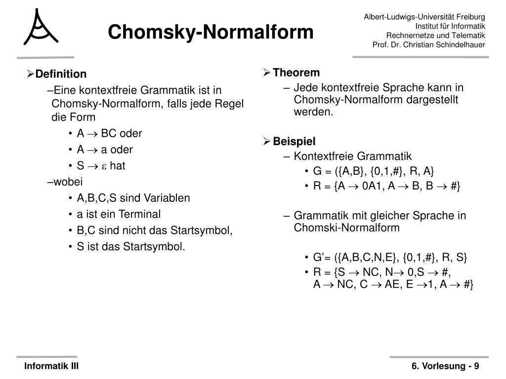 S aasc ws 19 20 automaten sprachen komplexität 11 8. Wenn eine unmarkierte variable xexistiert so dass auf der rechten seite einer produktion x. Sie ist nach dem linguisten noam chomsky benannt und kommt beim cyk algorithmus zum einsatz. Algorithmus zur erzeugung der chomsky normalform.