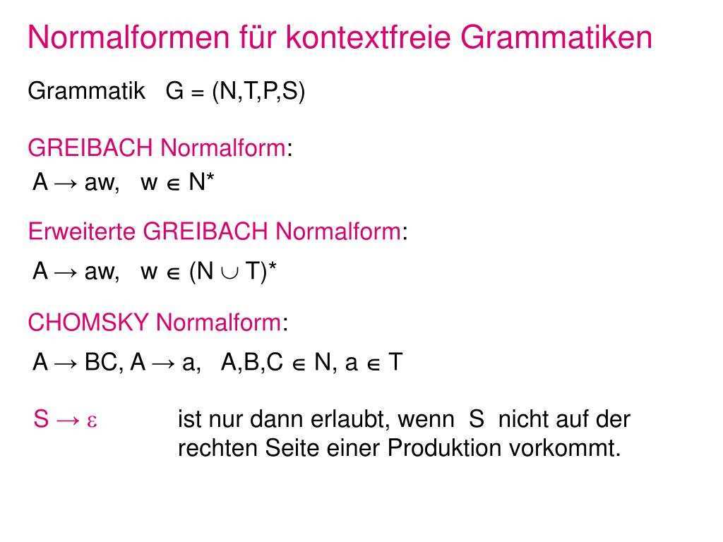 Dann wiederholen wir die folgende regel solange es geht. Eine eigenschaft der chomsky normalform ist dass jedes wort aus 2 cdot w 1 ableitungen gebildet werden kann. Chomsky normalform eine grammatik g v σ p s ist in chomsky normalform falls p v σ v vv. Deshalb kann aus jeder kontextfreien grammatik g.