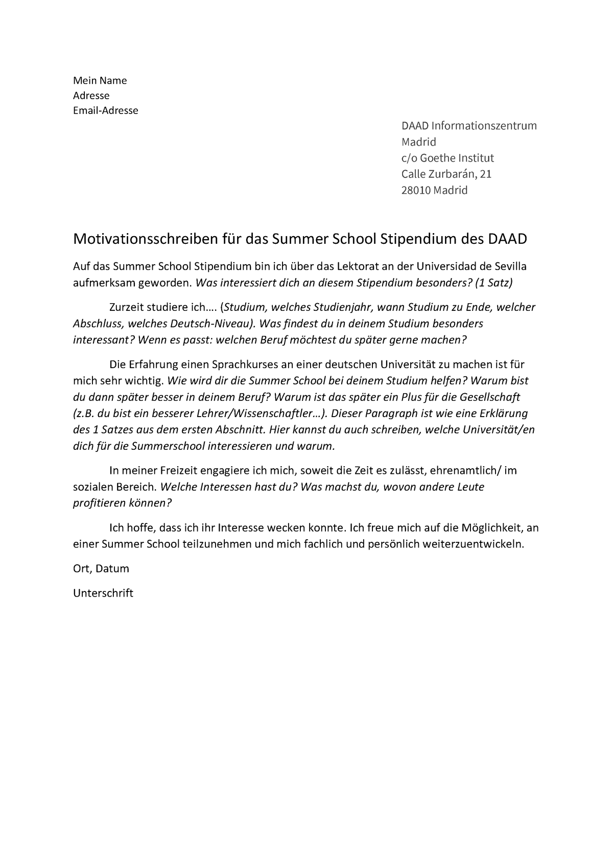 Daad motivationsschreiben beispiel. Daad deutscher akademischer austausch dienst german academic exchange service how to write a letter of motivation when applying for a graduate programme leading to master s degree in germany applicants are requested to submit a letter of motivation sometimes also called statement of purpose. Die kriterien sind je nach hochschule und studiengang unterschiedlich. Formal enthält das motivationsschreiben wie das anschreiben in der bewerbung einen briefkopf name adresse e mail und telefonnummer datum rechtsbündig überschrift einleitung hauptteil schluss grußformel und unterschrift auf die empfängeradresse hingegen können sie beim motivationsschreiben verzichten. Bevor sie ihren ersten entwurf schreiben erstellen sie einen detaillierten überblick dem sie ihren motivationsbrief folgen lassen.