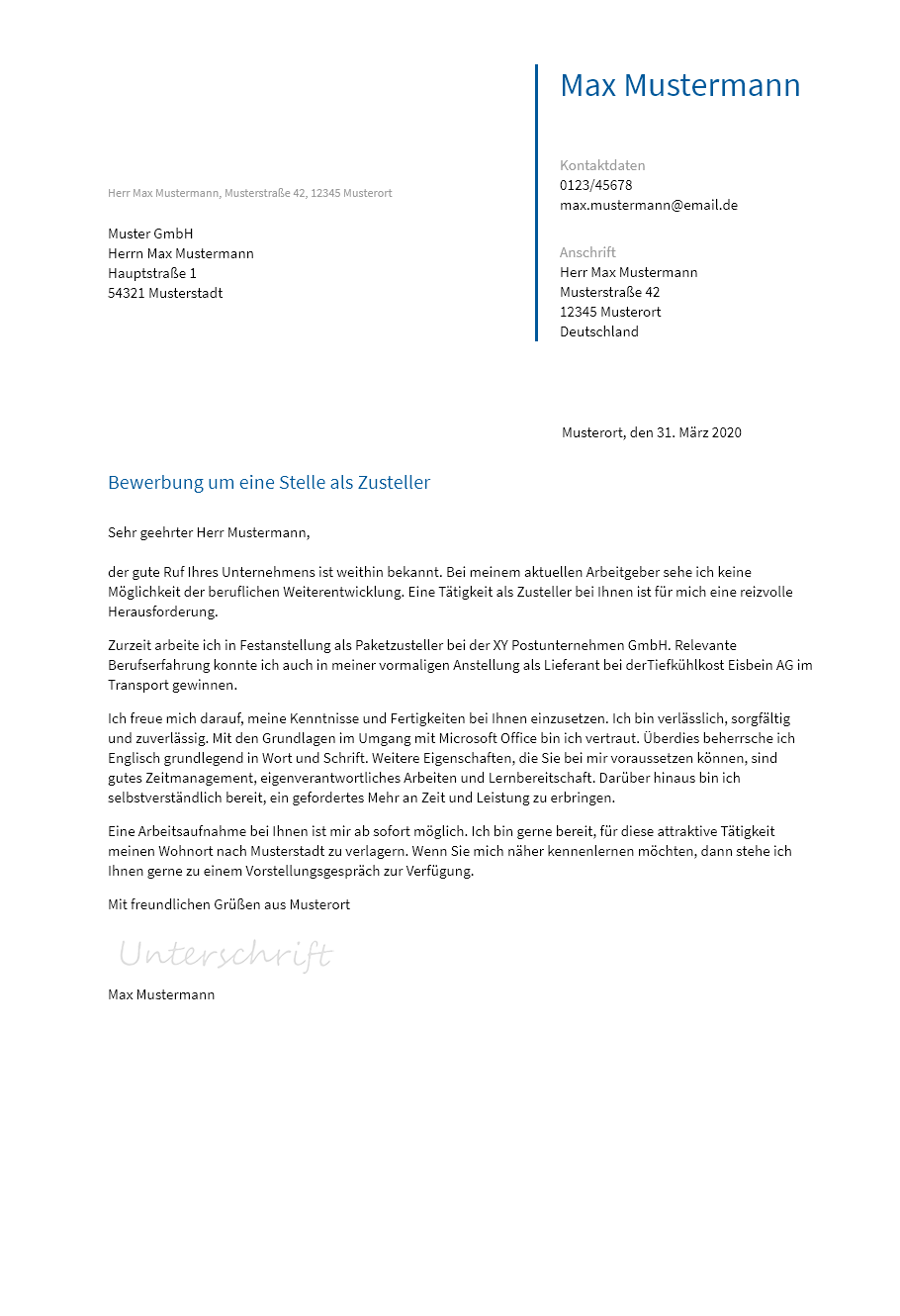 Bewerbung als postzusteller für den bereich xy sehr geehrte frau x geehrter herr y mit großem interesse habe ich von ihrem stellenangebot erfahren und bewerbe mich hiermit als postzusteller in ihrem unternehmen. Anschreiben lager und logistik als muster zur bewerbung. Bewerbung als paketzusteller sehr geehrte damen und herren meine ausbildung zur dienstleistungsfachkraft im postbetrieb und der gute ruf der deutschen post ag als führendes logistikunternehmen habe mich bestärkt ihnen eine initiativbewerbung zuzusenden. Beste muster und vorlagen für die perfekte bewerbung für ihre unterschiedlichen anforderungen herunter.