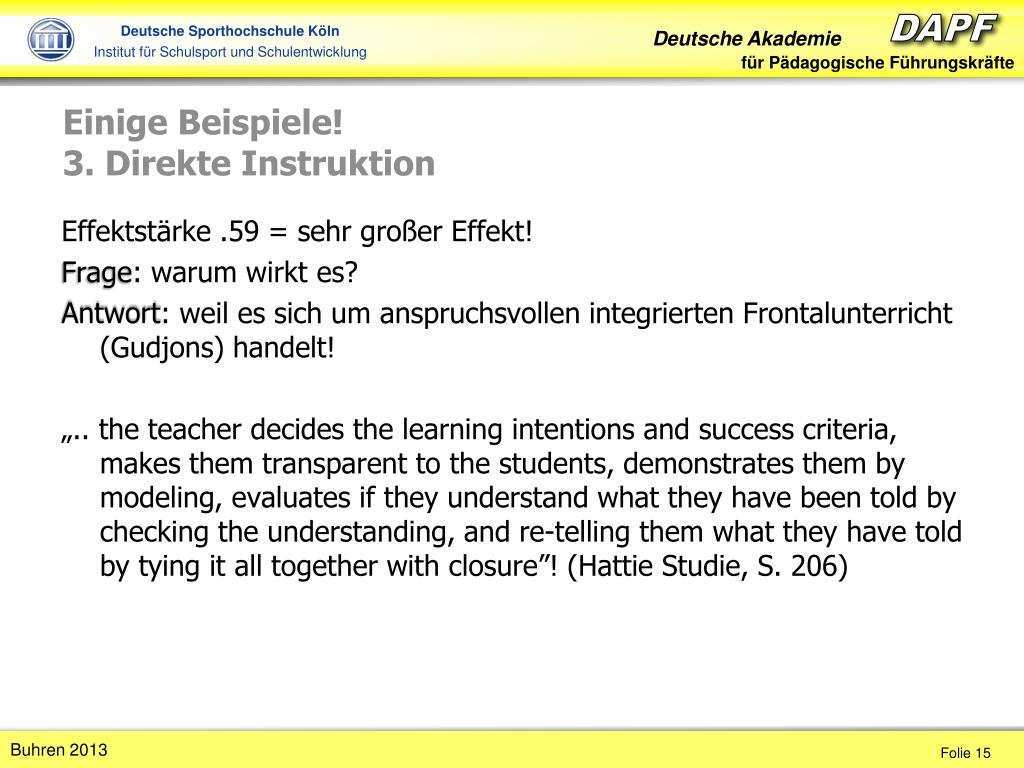 Direkte instruktion beispiel. Kompetenzen vermitteln mit der direkten instruktion eine beispielhafte unterrichtskonzeption. Ein vergleich mit frontalunterricht entwurf zusammengestellt von lena greber der von john hattie direkte instruktion direct instruction seltener direktes lehren direct teaching genannte sachverhalt wird oftmals mit frontalunterricht verwechselt. Die direkte instruktion ist ein anspruchsvolles unterrichtsarrangement das aus mehreren phasen besteht die aufeinander aufbauen und jeweils gut vorbereitet werden müssen. Dabei spielen das üben der schülerinnen und schüler sowie die differenzierte rückmeldung der lehrkraft an die einzelnen schülerinnen und schüler eine entscheidende rolle.