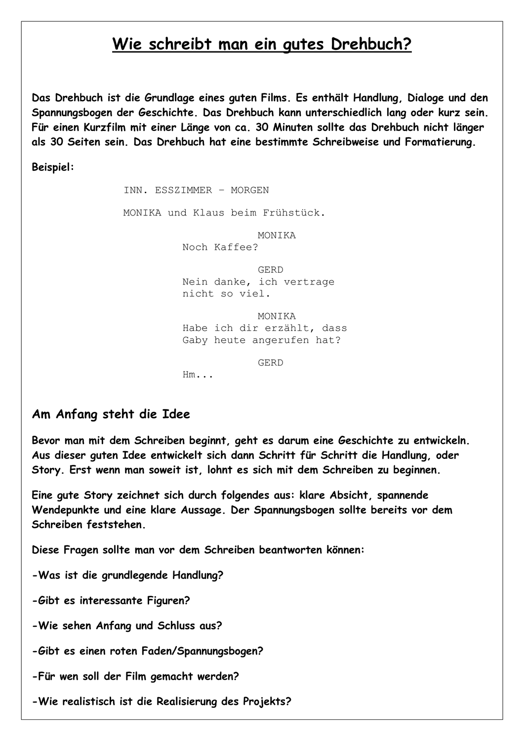 Das drehbuch dient als grundlage für einen film und daher ergeben sich besonderheiten die du beachten musst. Download vorlage für word microsoft office die zip datei enthält folgende komponenten kurzanleitung drehbuch formatvorlage für word ab version 2007 ab version 2000 mittels compatibility pack kurzes beispieldrehbuch tastaturbeschriftung zum ausdrucken und aufkleben. Die person en löffeln schweigend ihr müsli. Nachdem wir ihnen in einem anderen beitrag ein beispiel für ein drehbuch gegeben haben möchten wir ihnen hier gerne ein muster zur verfügung stellen.