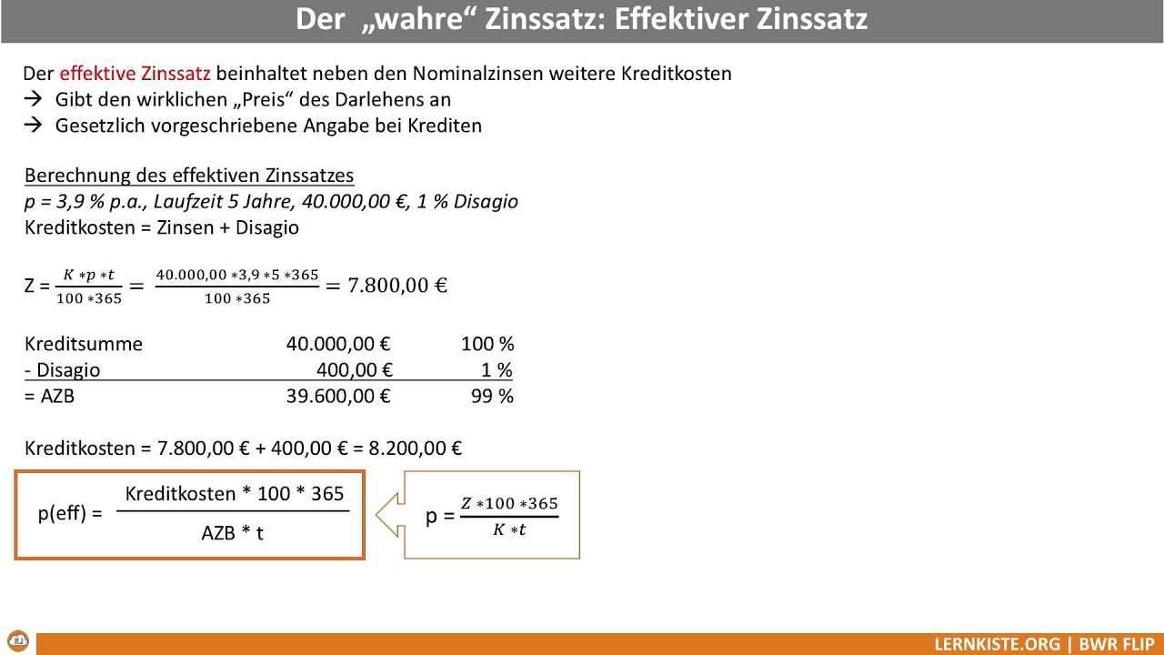 Zusätzliche gebühren disagio. In diesem beispiel wird von einem festen zinssatz ausgegangen wie er bei den meisten kreditangeboten vorzufinden ist. Die eingangsvariablen für die berechnung des effektiven jahreszins sind das nettodarlehen in euro die kreditkosten in euro und die laufzeit in monaten. Berechnung effektiver jahreszins in.