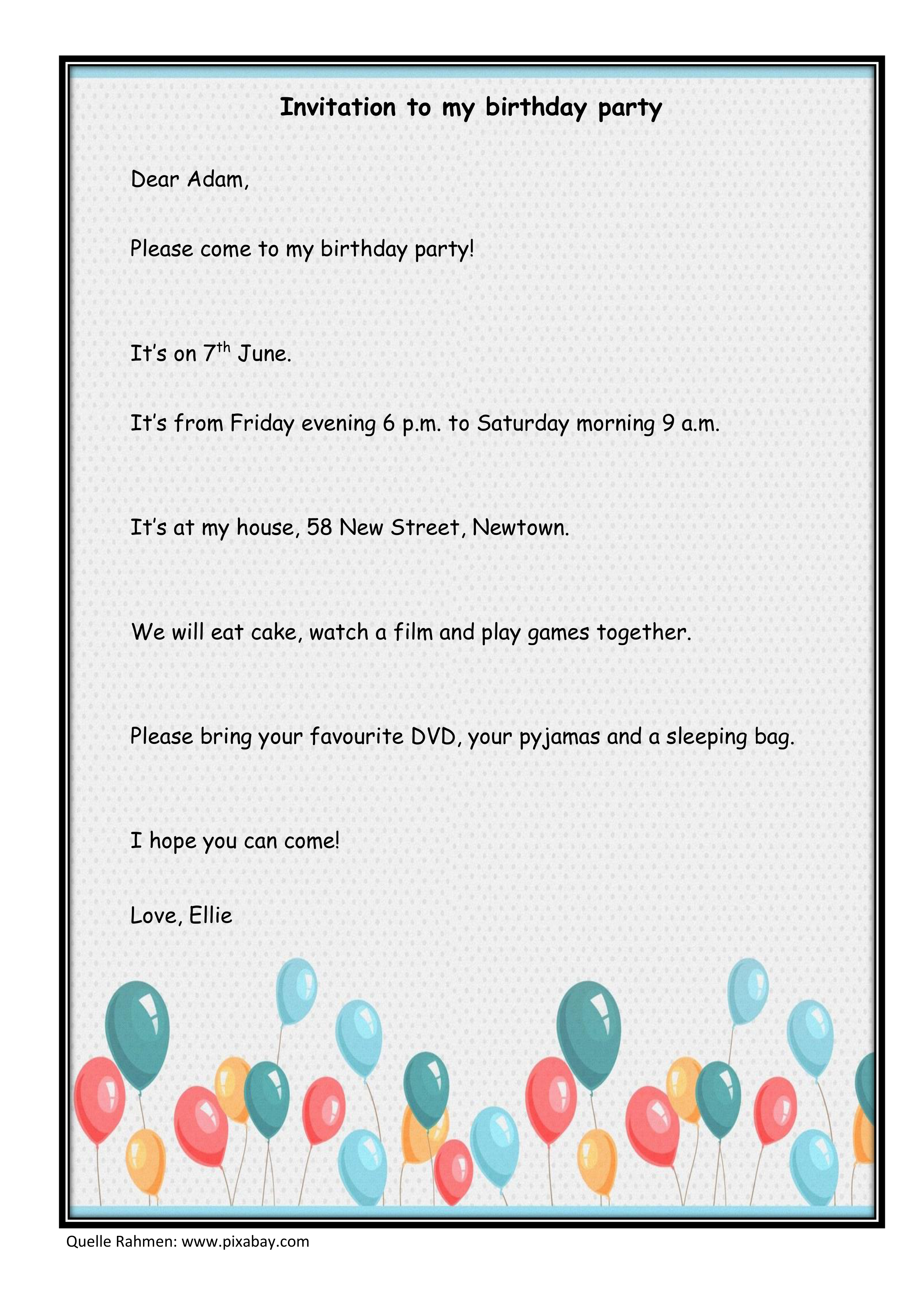 Surprise geburtstag einladung formuliert ausdrücklich auf die art des geheimnisses zu demonstrieren. Einladung auf englisch beispiel 6 einladung zur geburtstagsparty. The invitation is sent to all of the addressees. Viele übersetzte beispielsätze mit vorlage einladung englisch deutsch wörterbuch und suchmaschine für millionen von englisch übersetzungen.