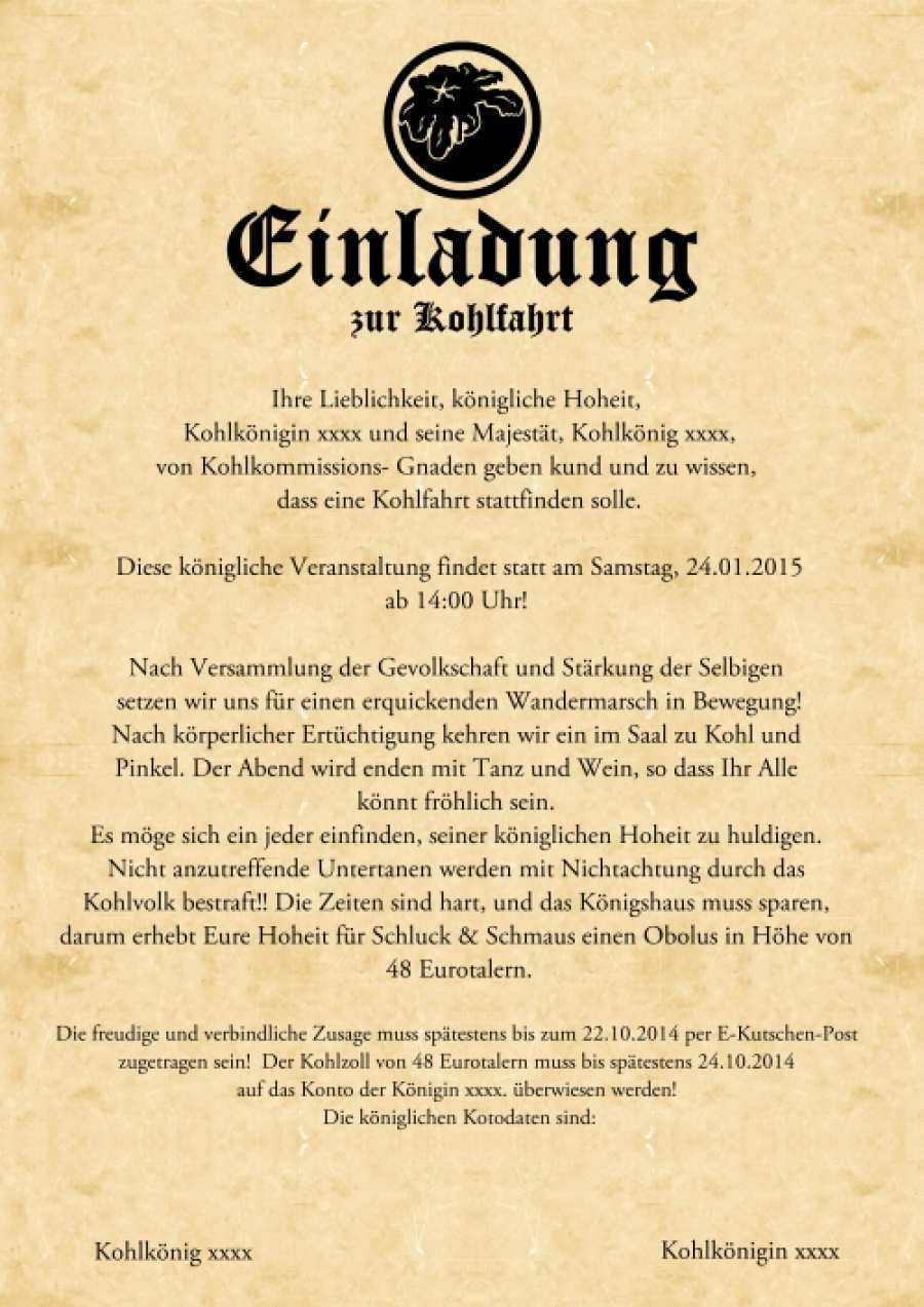 Kohlfahrt einladung pdf 53 herunterladen einladung. Einladung kohlfahrt liebe königspaare hier haben wir die passende einladung für eure kohltour. Verwandte beiträge 35 neu einladung zur kohlfahrt vorlagen foto. Fehlt es ihnen an ideen für ein einladungsschreiben zur kohlfahrt.
