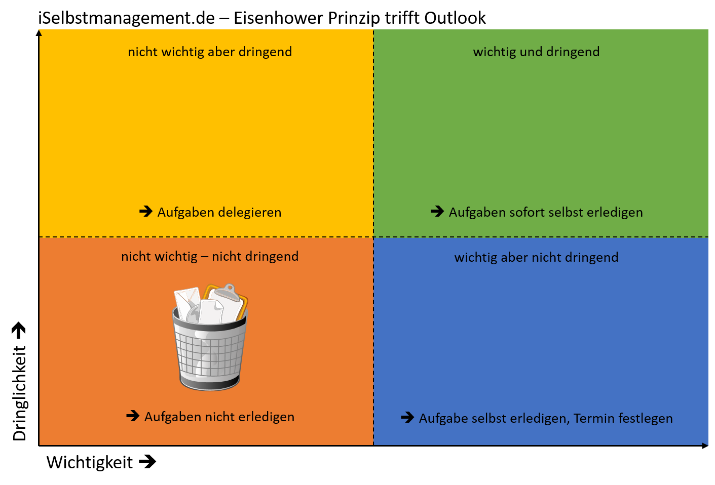 Das eisenhower prinzip ist also letztlich nur eine von vielen zeitmanagement methoden und strategien. Das eisenhower prinzip ordnet nach wichtigkeit und dringlichkeit quadrant 1 q1 also aufgaben welche sehr dringlich und sehr wichtig sind sollten schnellstmöglich von einem selbst erledigt werden aufgaben im zweiten quadranten q2 sind zwar wichtig aber nicht allzu dringlich weshalb man diese zwar immer noch selbst erledigen sollte. So arbeiten sie mit dem eisenhower prinzip. Er wählt diesen selbst aus und verschiebt diese aufgabe in den papierkorb.