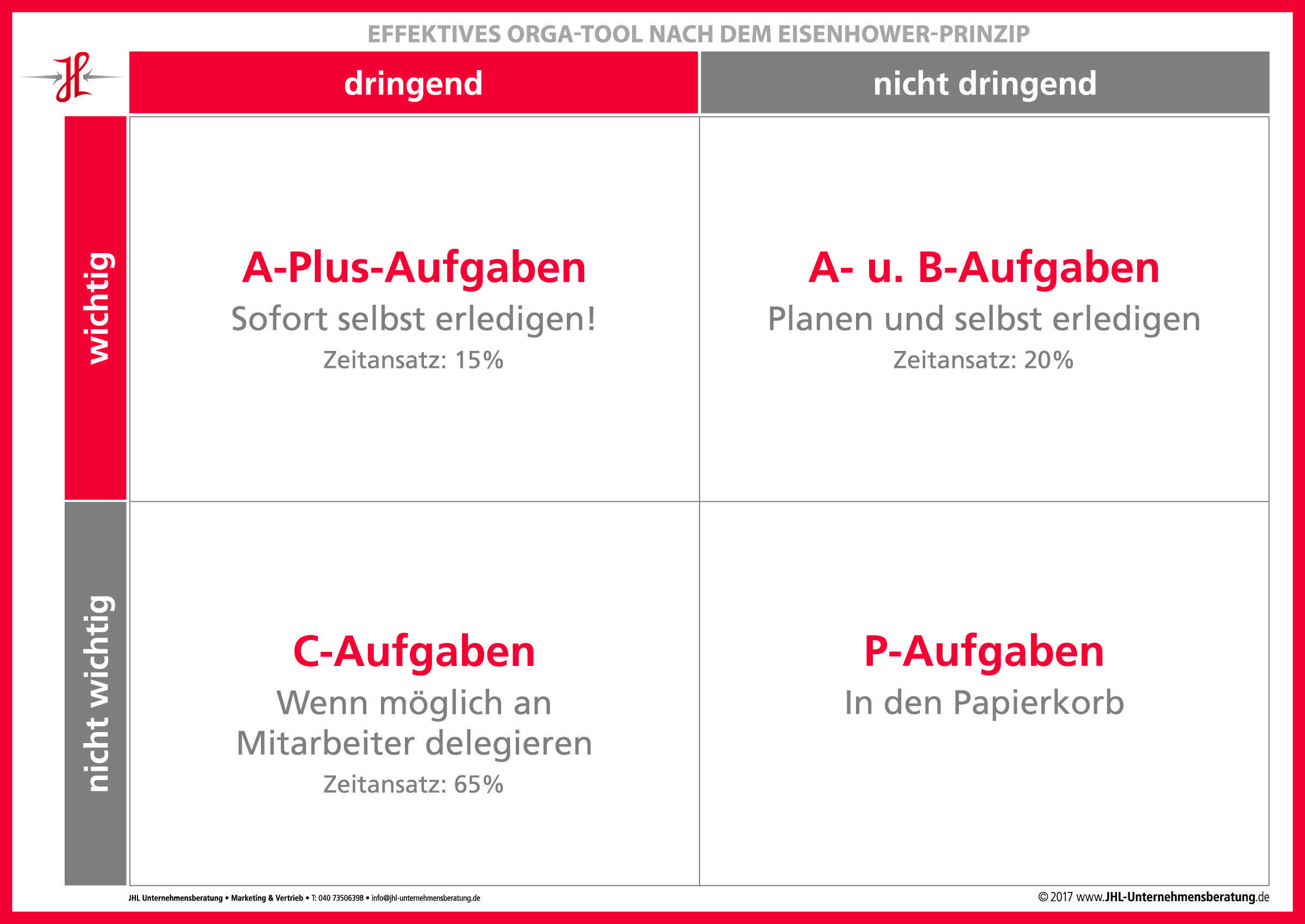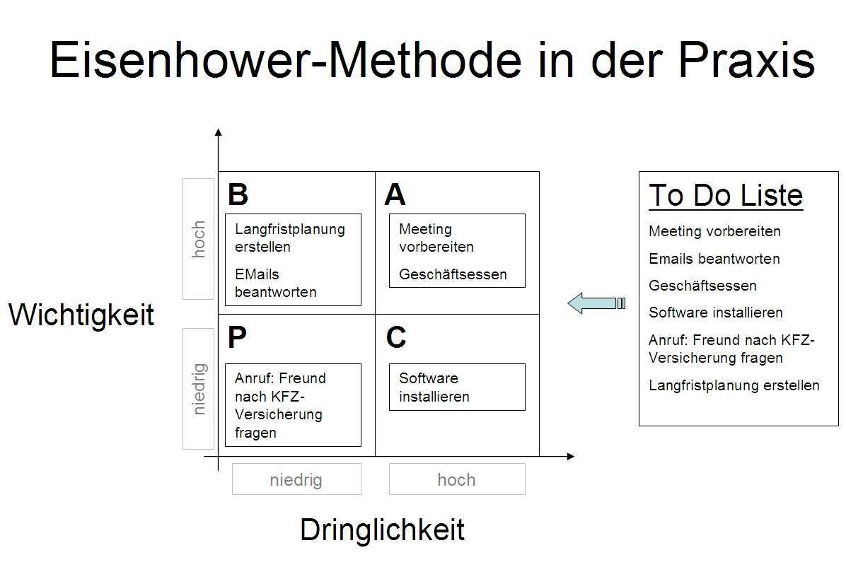 Eisenhower prinzip beispiel. Ein beispiel zur eisenhower regel. Regelmäßig anstehende aufgaben mit hilfe der vier felder matrix priorisieren zum beispiel jeden morgen vor arbeitsbeginn oder auch wenn sich situationen plötzlich und unerwartet ändern. Egal für welche methode sie am ende entscheiden und welche am besten zu ihnen und ihren aufgaben passt. Ein beispiel ein mitarbeiter sitzt um 9 uhr in seinem büro in berlin.