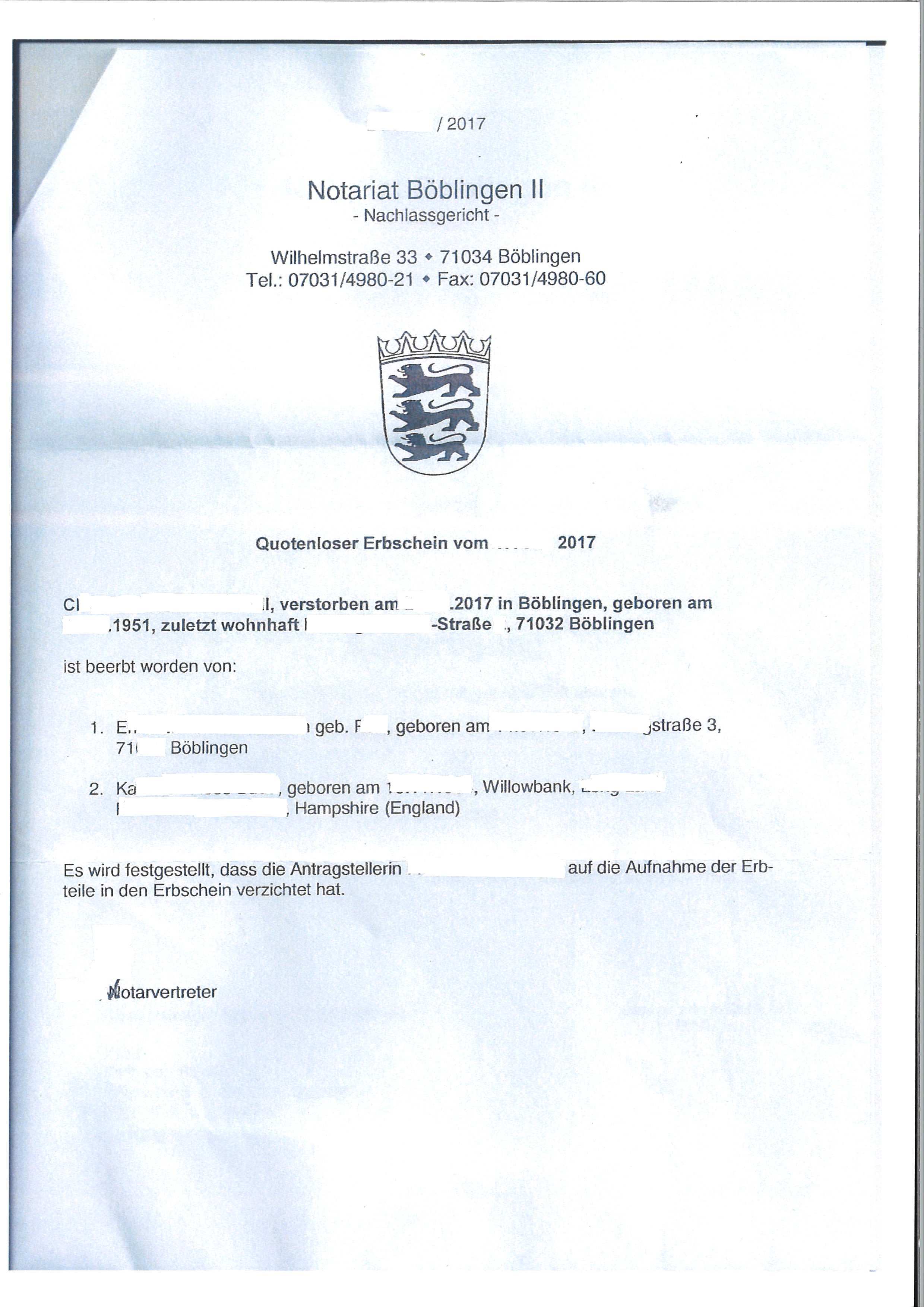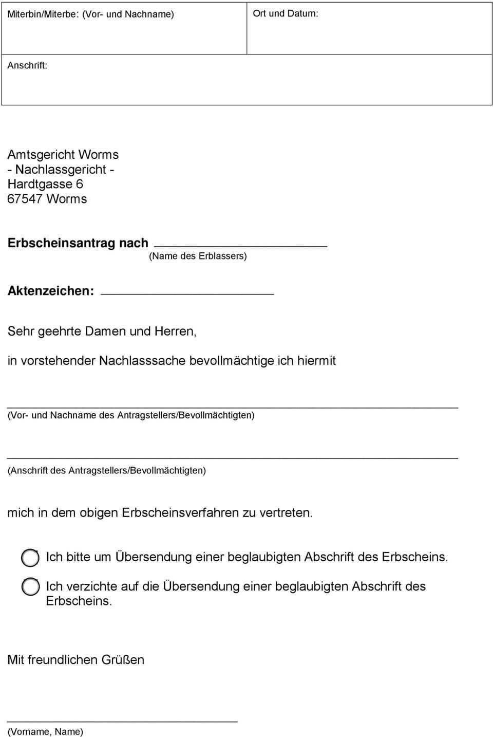 Erbschein beantragen muster. Ich erkläre dass dieser mit folgendem inhalt zu erteilen ist. So können miterben denen eine vollmacht erteilt wurde erledigungen z b. Muster vorlage jeder erbfall ist individuell dennoch kann eine muster vorlage zum beantragen eines erbscheins nützlich sein. Da ein erbfall aber immer sehr individuell ist sollte dieses muster lediglich als grundlage genutzt und auf ihren individuellen fall zugeschnitten werden.