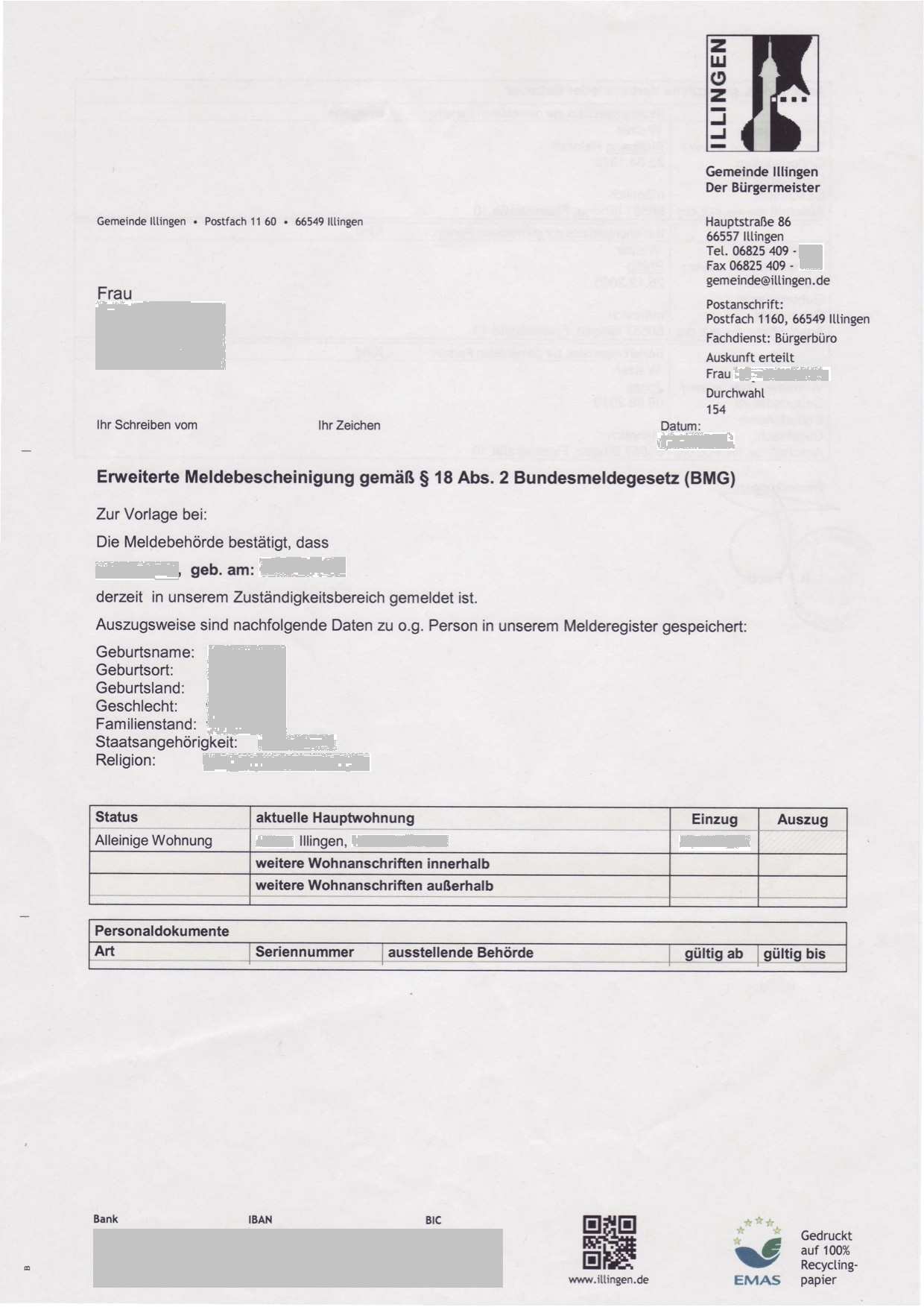 Außerdem muss eine meldebescheinigung jeder mit sich führen der sich mit einem reisepass ausweist. Muster einer übersetzung einer erweiterten meldebescheinigung aus werther aus dem deutschen ins englische.