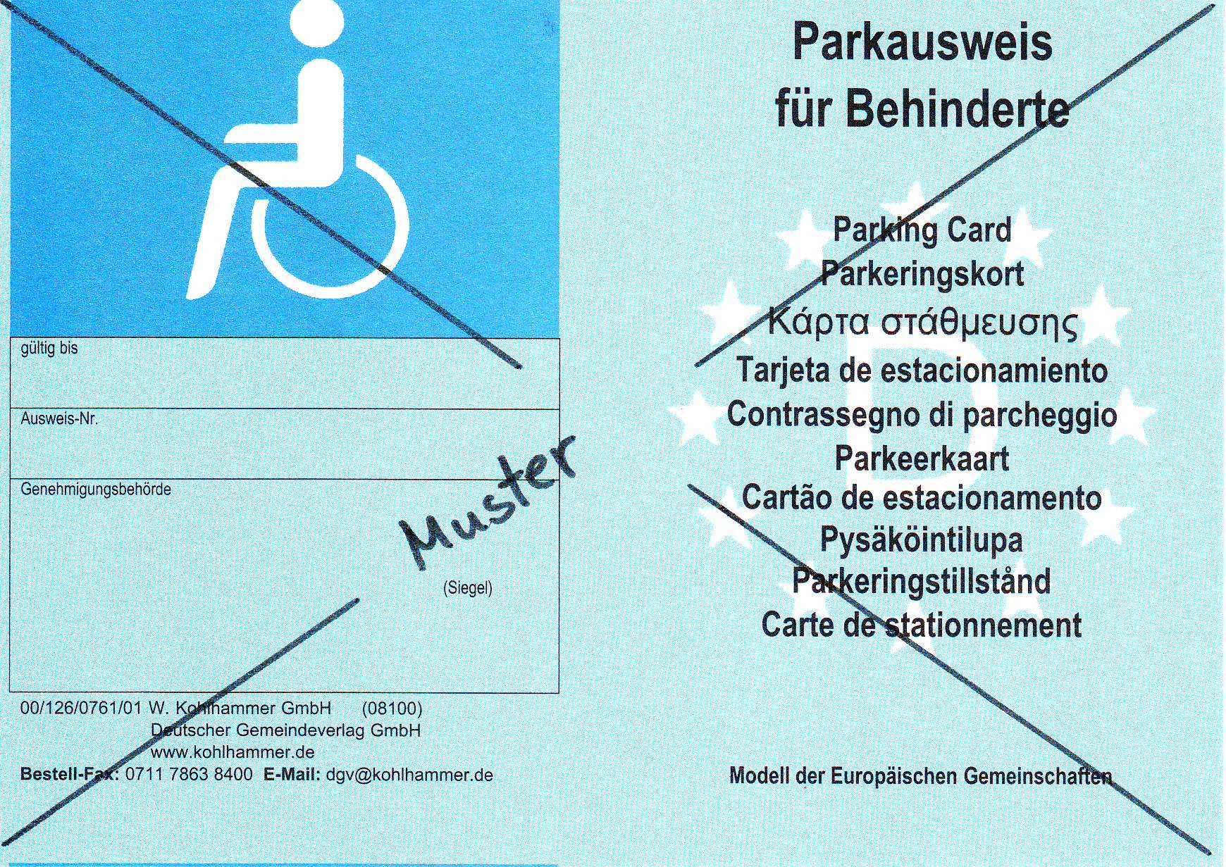 Eu parkausweis muster. Wer ab 2011 ohne diesen parkausweis oder mit dem alten dann ungültigen parkausweis auf ausgewiesenen behindertenparkplätzen parkt begeht eine ordnungswidrigkeit. Blauer eu parkausweis seit dem 01 01 2001 ist die kennzeichnung von behindertenparkplätzen bei allen mitgliedstaaten der europäischen union eu einheitlich geregelt. Der eu einheitliche blaue sonderparkausweis erlaubt. Parkerleichterungen mit dem blauen ausweis.