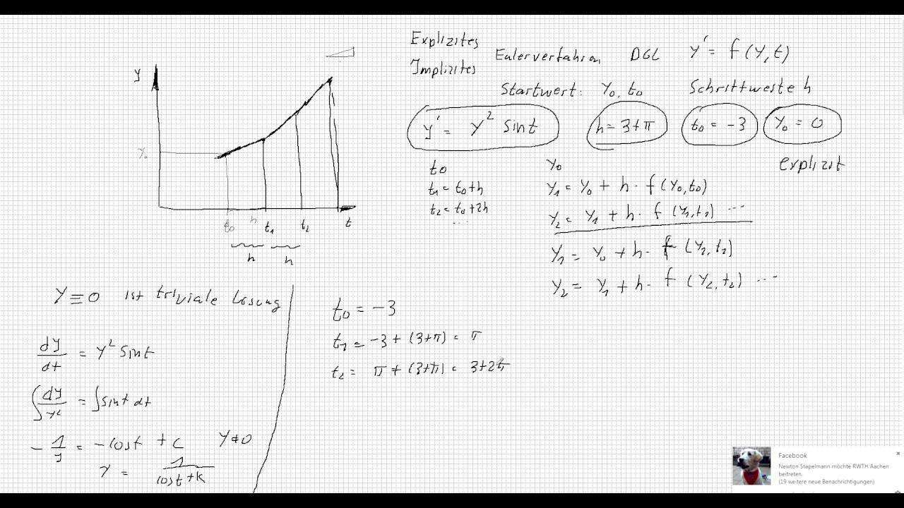 Das eulersche polygonzugverfahren oder explizite euler verfahren ist das einfachste verfahren zur numerischen lösung eines anfangswertproblems. Es wurde von leonhard euler 1768 in seinem buch institutiones calculi integralis vorgestellt. Yt fty yt tyt y0 01. Cauchy benutzte es um einige eindeutigkeitsresultate für gewöhnliche differentialgleichungen zu beweisen.