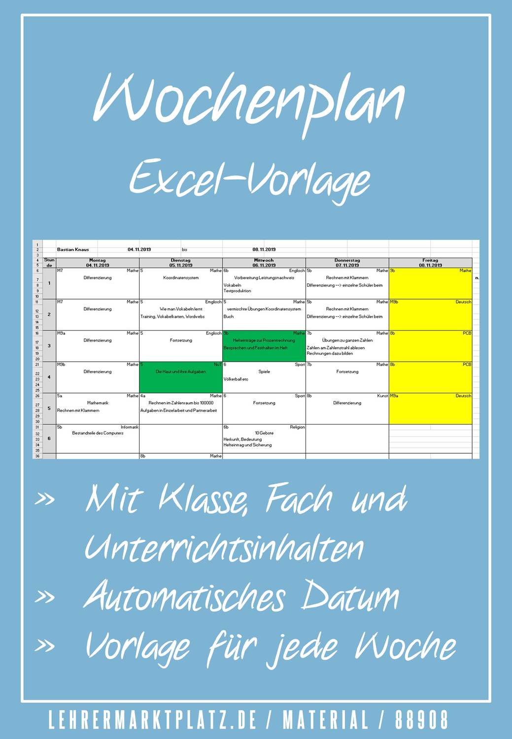 Auf muster vorlage ch können sie eine kostenlose wochenplan vorlage excel format herunterladen. Du hast unter dem wochenplaner eine kleine legende in der du vier verschiedene kategorien anlegen kannst. 1h takt montag freitag 06 00 18 00 uhr kalenderwoche aktualisiert sich von selbst jeweils aktuelle kalenderwoche designfarbe. Einen monatskalender für das gesamte jahr.