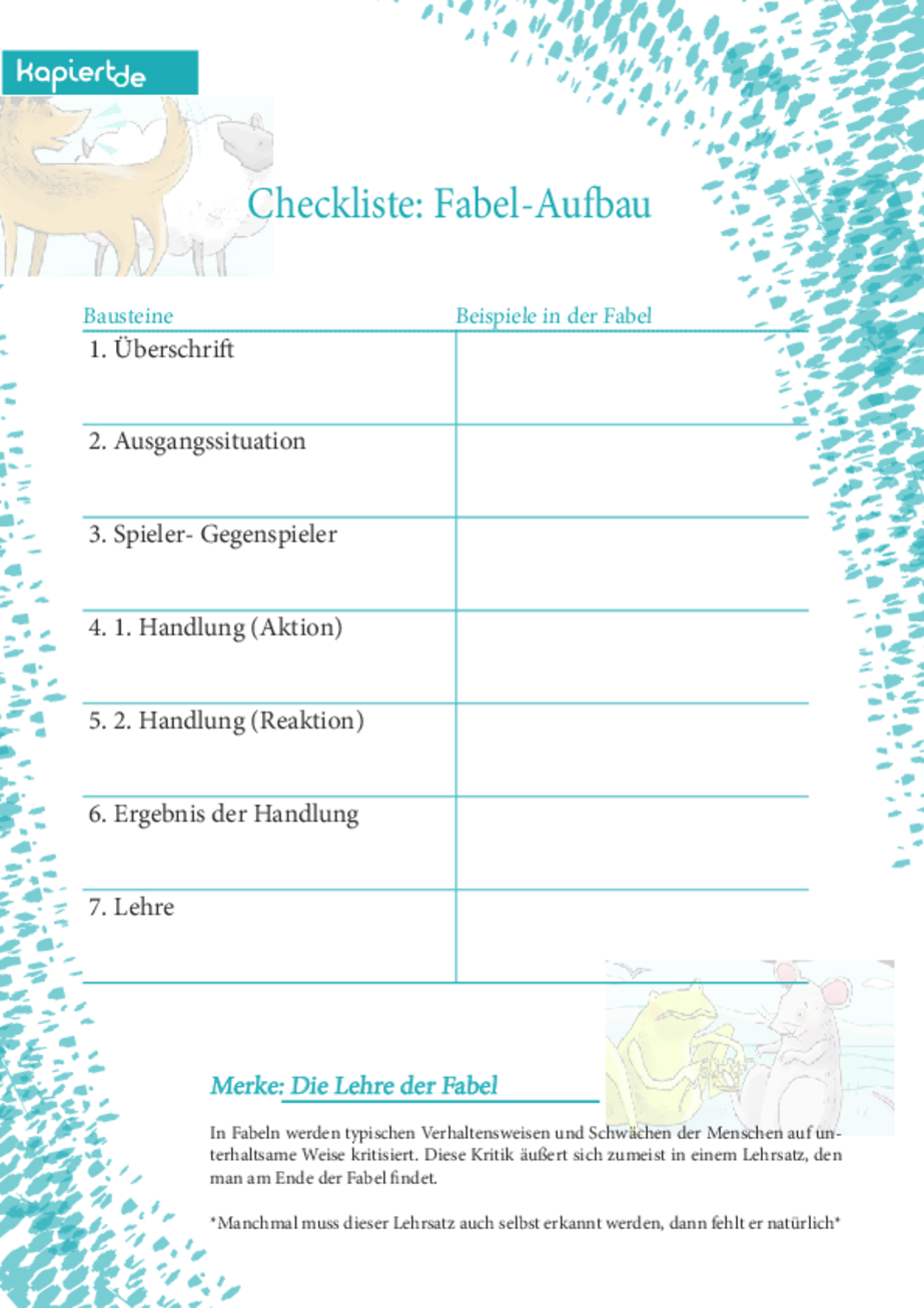 Fabel beispiel 6 klasse. Mehr bei kapiert de für deutsch klasse 5 bis 10 mit vielen erklärungen zu allen unterrichtsthemen. Die fabel ist eine kurze erzählung die eine lehre für den leser beinhaltet. Das kostenlose arbeitsheft fabeln mit 52 seiten als download 00 regeln zu fabeln fabel wissen 01 eine fabel zusammensetzen 02 eine fabel neu zusammensetzen 03 menschliche eigenschaften tiere in fabeln 04 menschliche eigenschaften tiere in fabeln. Fabeln im unterricht in klasse 5 und klasse 6.