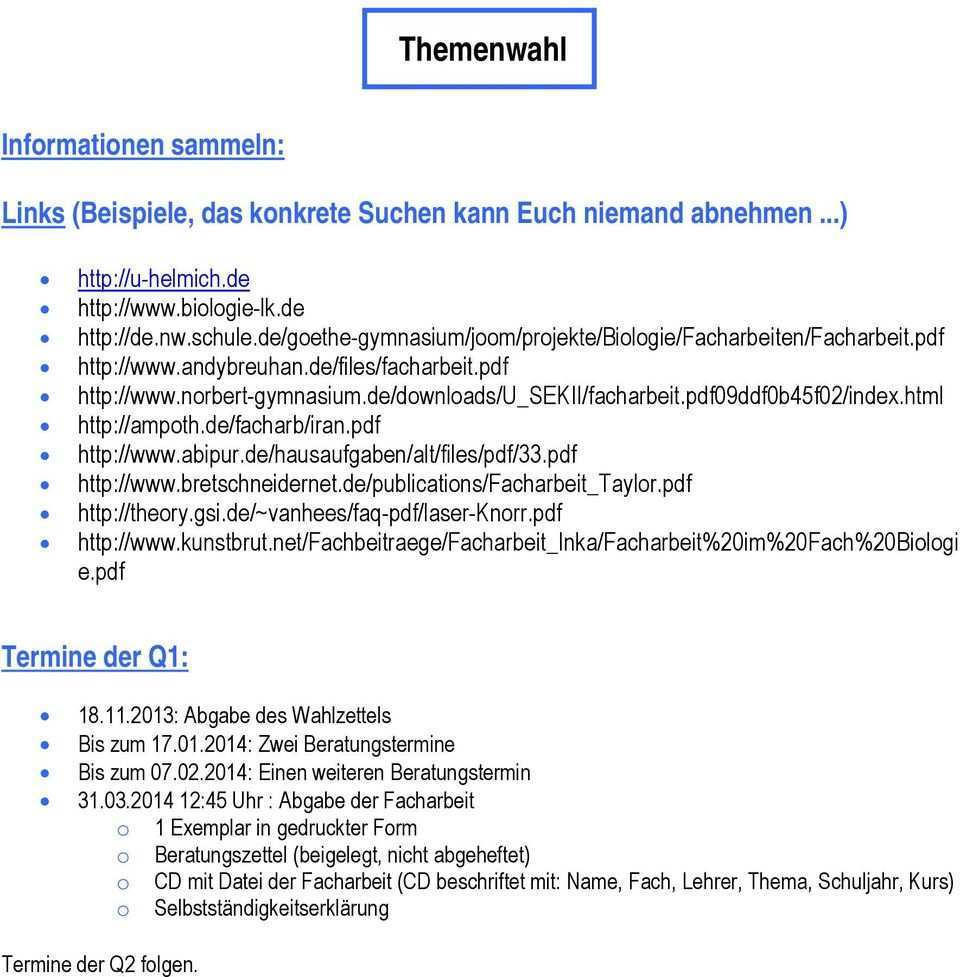 Facharbeit muster 01 pdf schülerrat der oberschule weixdorf 20 21 facharbeiten hinweise facharbeit beispiel facharbeit mustervorlage facharbeit hinweise zu zitaten und quellen facharbeit downloadbereich 13. Seit einigen jahre wird eine klausur in der oberstufe im grund oder leistungskurs ersetzt durch eine facharbeit. Facharbeit muster und facharbeit vorlage des albertus magnus gymnasiums. Beispiel einer hausarbeit das nachfolgende beispiel einer vorzüglichen hausarbeit entstammt meiner lehrtätigkeit ist also nicht konstruiert und daher gewiß nicht in jedem formalen und inhaltlichen punkt unangreifbar.