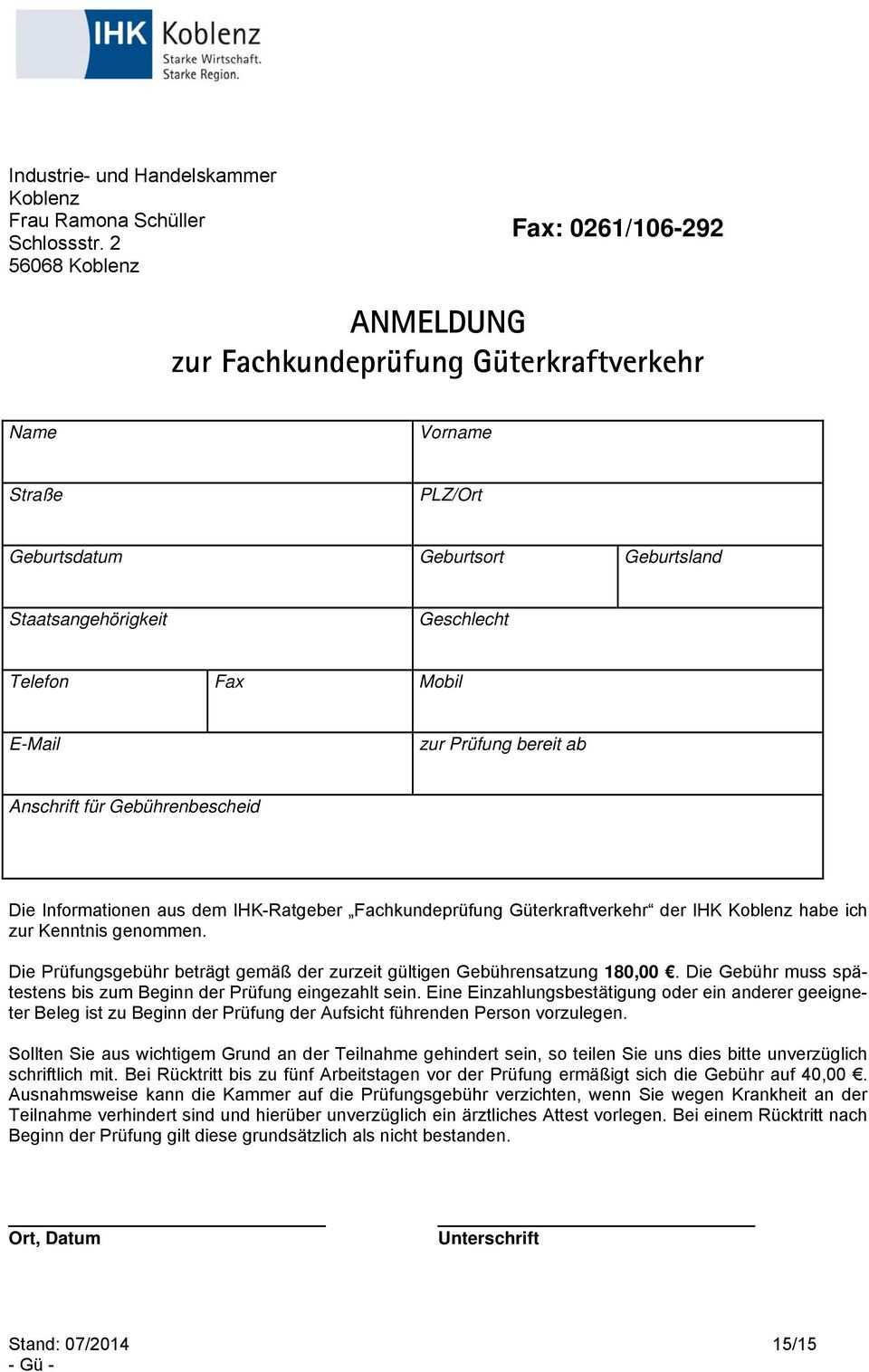2 bis 3 wochen vor dem ihk prüfungstermin eine einladung zur prüfung sowie einen gebührenbescheid. Für die gewerbliche beförderung von gütern mit kfz deren zulässiges gesamtgewicht einschl. Die fachliche eignung ist durch eine bescheinigung nach dem muster des anhangs iii der verordnung eg nr. Eine schriftliche anmeldung zur prüfung ist über die verlinkten anmeldeformulare erforderlich.