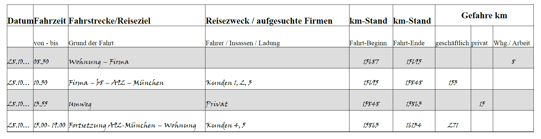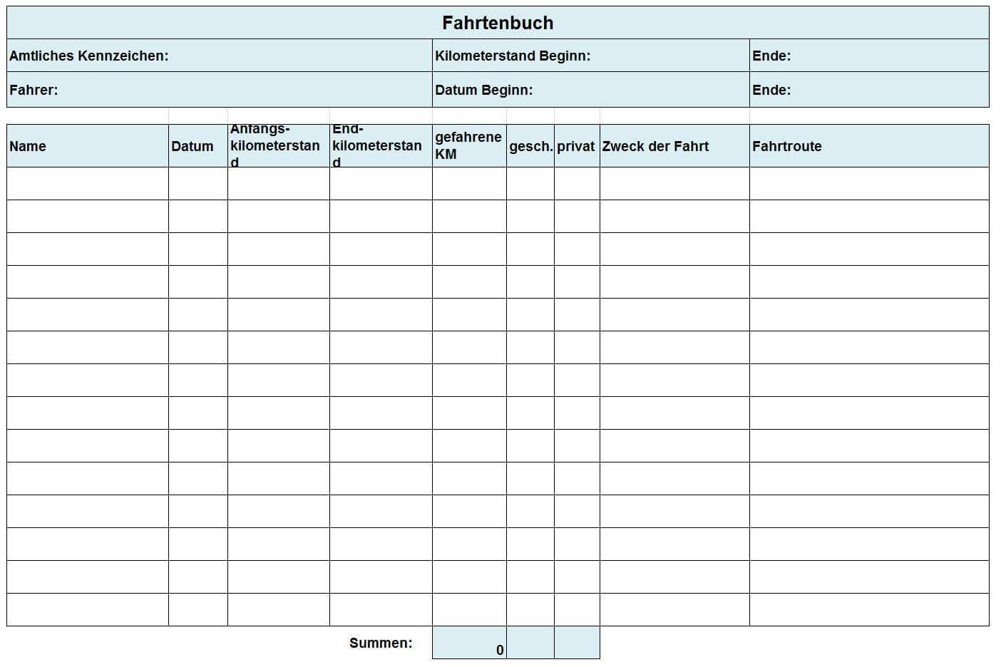 Fahrtenbuch muster ausgefuellt. Für alle geschäftlichen fahrten muss das fahrtenbuch folgende angaben enthalten. Lade dir die fahrtenbuch vorlage für microsoft excel herunter. Nähere angaben dazu müssen jedoch nicht gemacht werden. Trage direkt rechts daneben den kilometerstand des fahrzeuges zu fahrtbeginn ein.