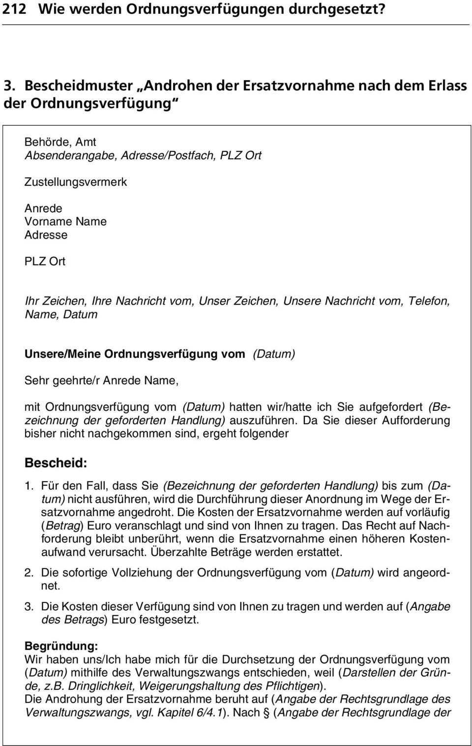Drohe ich ihnen ersatzvornahme die kosten der ersatzvornahme werden ihnen dann auferlegt unmittelbaren zwangan kostenentscheidung die kosten des verfahrens haben sie zu tragen. Sehr geehrte damen und herren hiermit lege ich legen wir gegen die festsetzung eines zwangsgeldes in höhe von betrag euro vom datum einspruch ein und beantrage beantragen die.