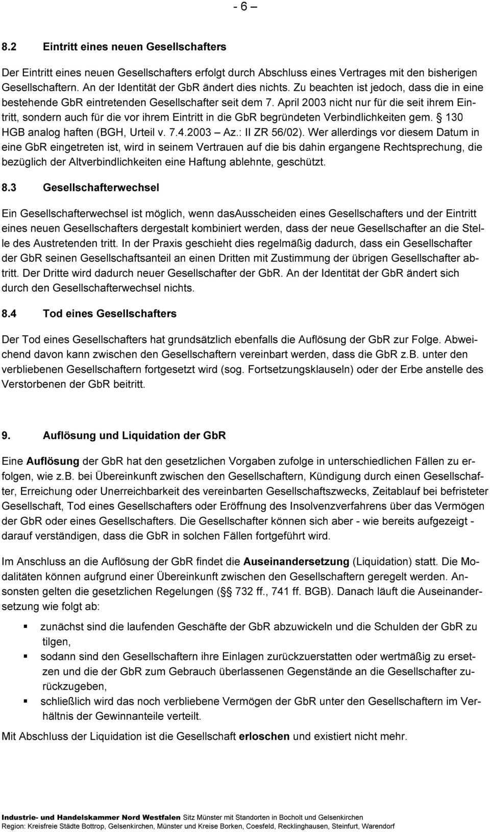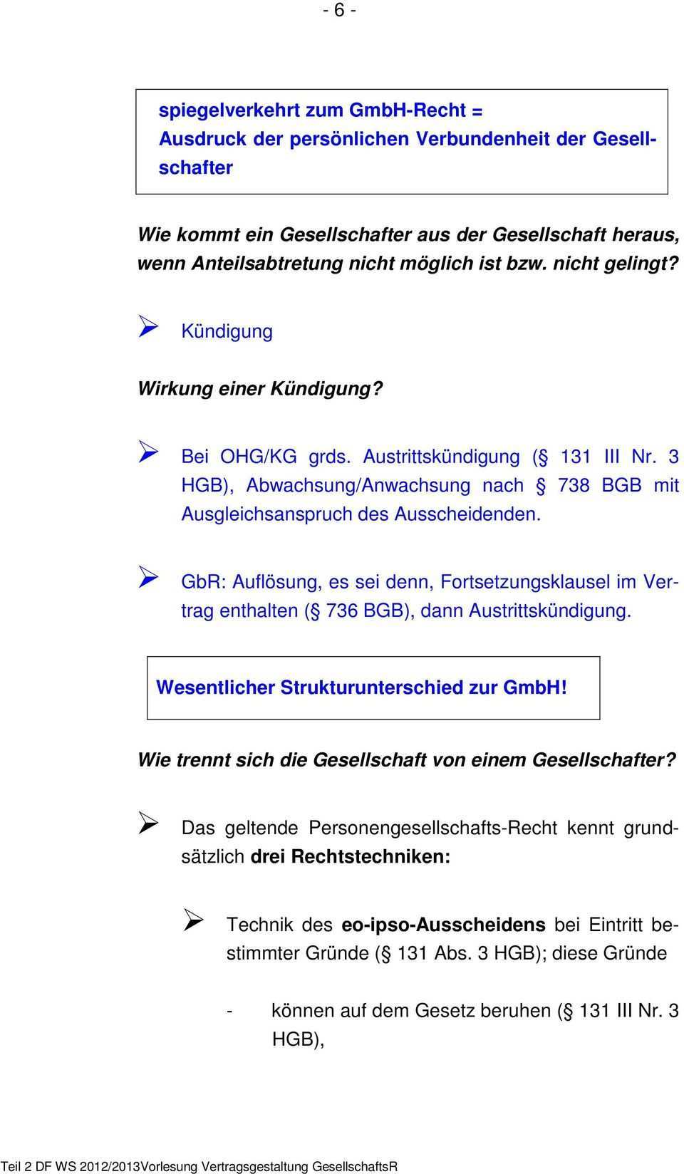 Münchkomm ulmer bgb 736 rz. Bei insolvenz oder ausschließung eines gesellschafters sowie bei kündigung der gesellschaft durch einen gesellschafter wird die gesellschaft nicht aufgelöst sondern nach ausscheiden des betroffenen gesellschafters von den übrigen gesellschaftern fortgesetzt muster unverbindlich. Der gesellschaftsanteil der fortführenden gesellschafter wächst um den anteil des verstorbenen gem. Gestaltungsmöglichkeiten bei der gbr.