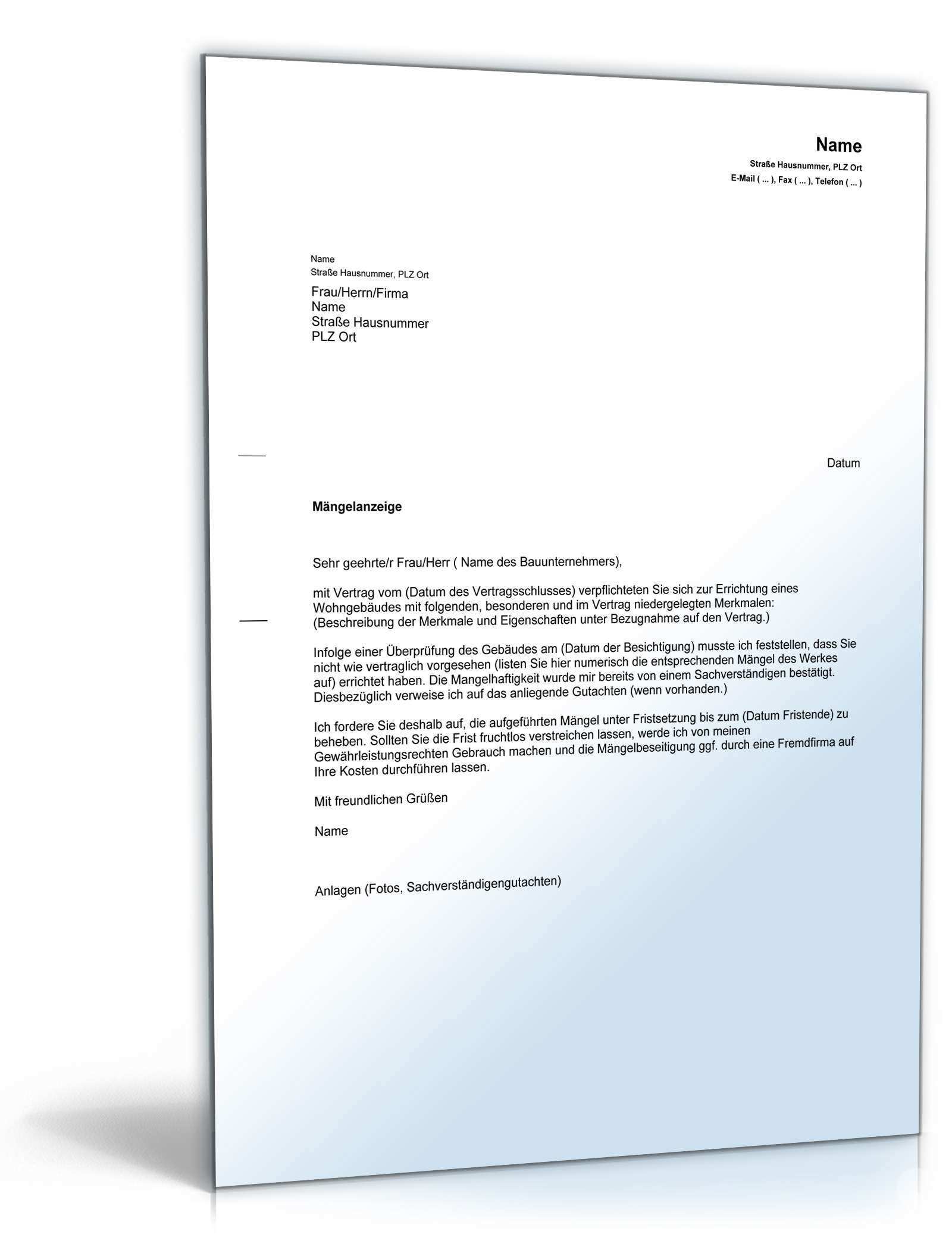 Wenn anschließend der handwerkerfirma eine frist zur nachbesserung gesetzt und eine eventuelle selbstvornahme angezeigt wird können nach erfolglosem fristablauf die mängel entweder selbst behoben oder ein anderer handwerker mit der mängelbeseitigung beauftragt. Musterbriefsammlung von rechtsanwalt thomas hollweck. Anstatt ihnen die formalien zu erklären haben wir ein mängelanzeige vob muster erstellt. Bitte hier klicken hier finden sie eine sammlung kostenloser musterbriefe und musterschreiben aus verschiedenen rechtsbereichen des verbraucherrechts ich empfehle ihnen die hier veröffentlichten musterschreiben per einschreiben mit rückschein zu versenden oder.