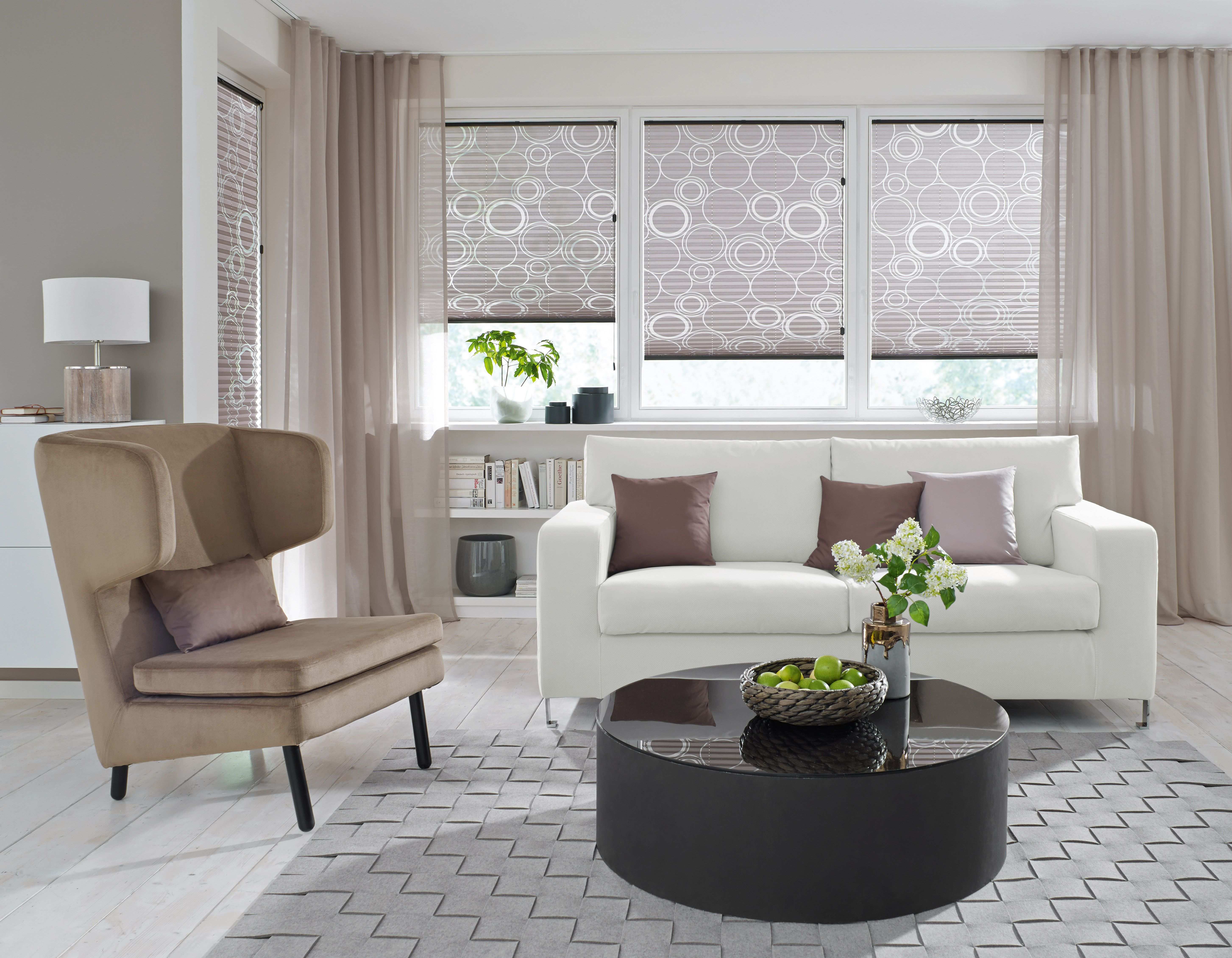 Die gardinen passen perfekt zu den tapeten mit blumenmuster in der gleichen farbe. überlegen sie zuerst wie groß ihre fenster sind und schauen sie sich genau an ob die gewünschten gardinen zur. Nach einem ersten persönlichen gespräch in unserem showroom oder bei ihnen vor ort nehmen wir aufmaß und planen mit ihnen gemeinsam ganz nach ihren ansprüchen und wünschen. Wohnzimmer schiebevorhang in lilabeige mit braunen bogen von gardinen muster für wohnzimmer bild.