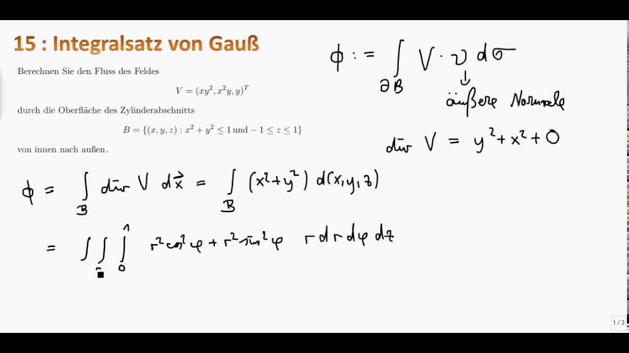3 die integralsätze von gauß und stokes 3 1der gaußsche integralsatz 3 1definition esseig rn n n n 2 einbeschränktesgebietundk n einenatürlichezahl gheißtck glattberandet fallseszujedema geine offene umgebung u u a rn von aund eine k mal stetig differenzierbare funktionh u r gibt sodass. Wir wenden nun den gaußschen integralsatz an. T 2 0 2ˇ fl acheninhalt areaa 1 2 z c r d r 1 2 z2ˇ 0 acost bsint asint dt cost dt 1 2 ab z2ˇ 0 1dt ˇab fl achenberechnung mit dem satz von gauˇ 4 1. Beispiel polyeder v mit inkugel ber uhrt jede fl ache radius r i hesse normalform rds r z n const ds r i ds volumenberechnung mit dem satz von gauˇ 3vol v zz s rds zz s r ids r i area s hexaeder mit kantenl age a.
