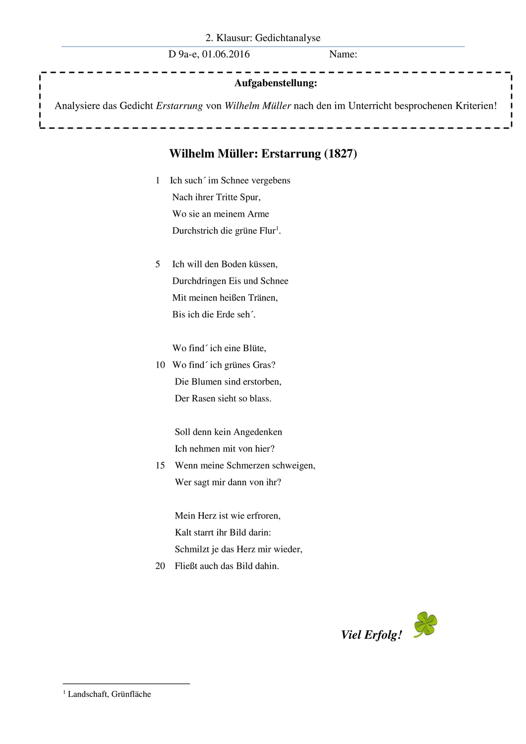 Bei einer gedicht oder songanalyse gibt es verschiedene aspekte zu beachten wie beispielsweise den aufbau das reimschema und sprachliche mittel wie genau du dabei vorgehst lernst du im weiteren verlauf des kurses. Beispiel einer gedichtanalyse kirschblüten bei nacht das gedicht kirschblüten bei nacht link öffnet einen neuen tab geschrieben von barthold heinrich brockes wird im folgenden analysiert wobei vor allem auf den interpretationsteil ein besonderes augenmerk gelegt wird. Die einleitung beschreibt das gedicht und stellt den äußeren rahmen für die interpretation dar. Zunächst sollst du dir hier einen basiswortschatz aneignen mit dessen hilfe es dir leichter fällt ein gedicht auf.