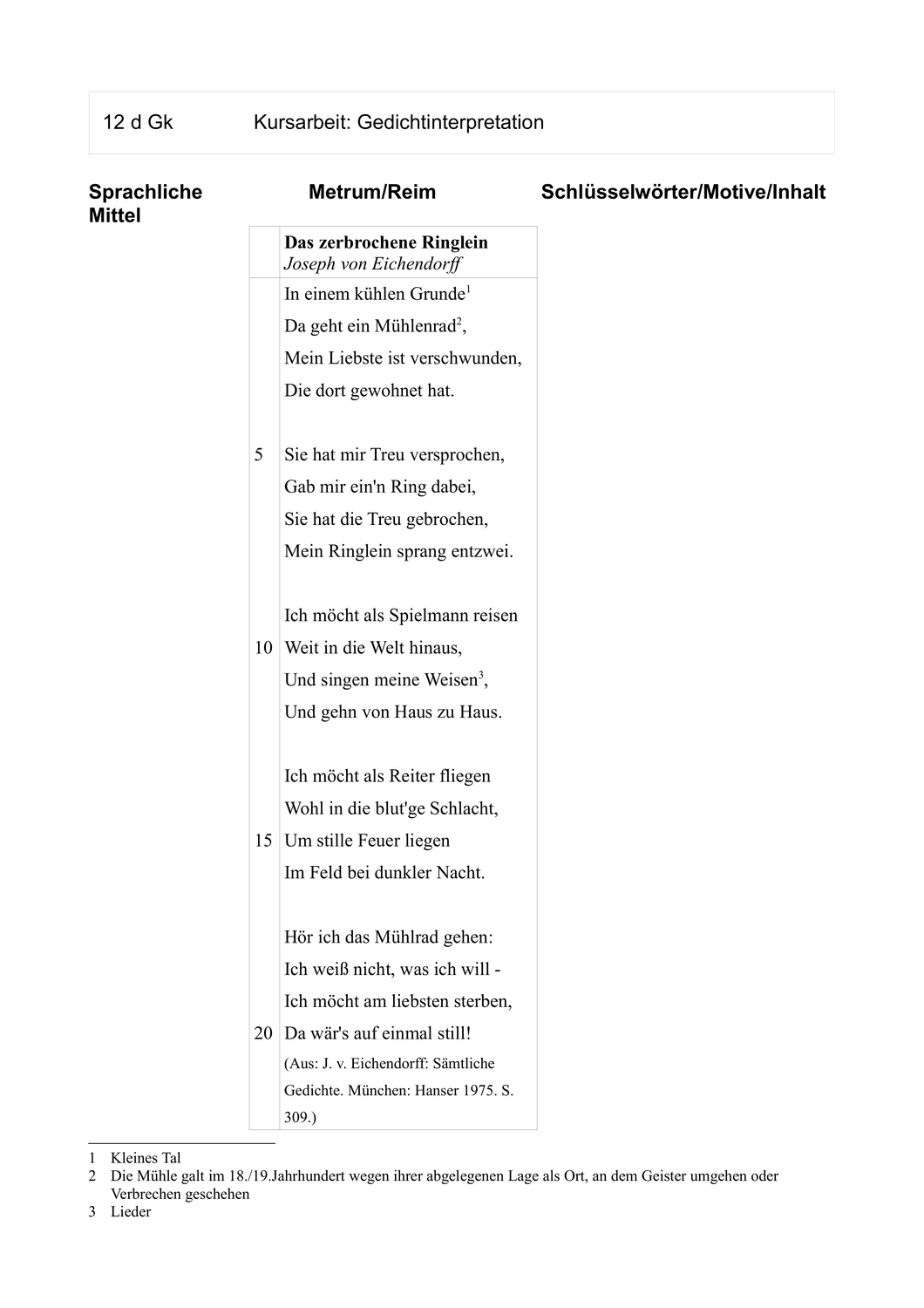 Lernen an stationen hey leute ich schreibe bald in deutsch eine klassenarbeit über gedichtinterpretation. Schluss abschlussbemerkunges gibt keine formulierungshilfen die für alle gedichtinterpretationen gelten man kann formulierungshilfen aber als einfache vorgabe verstehen die auf wichtige nicht auf alle punkte in. Reime reimschema in gedichten. Gedichtinterpretation klasse 9 beispiel.