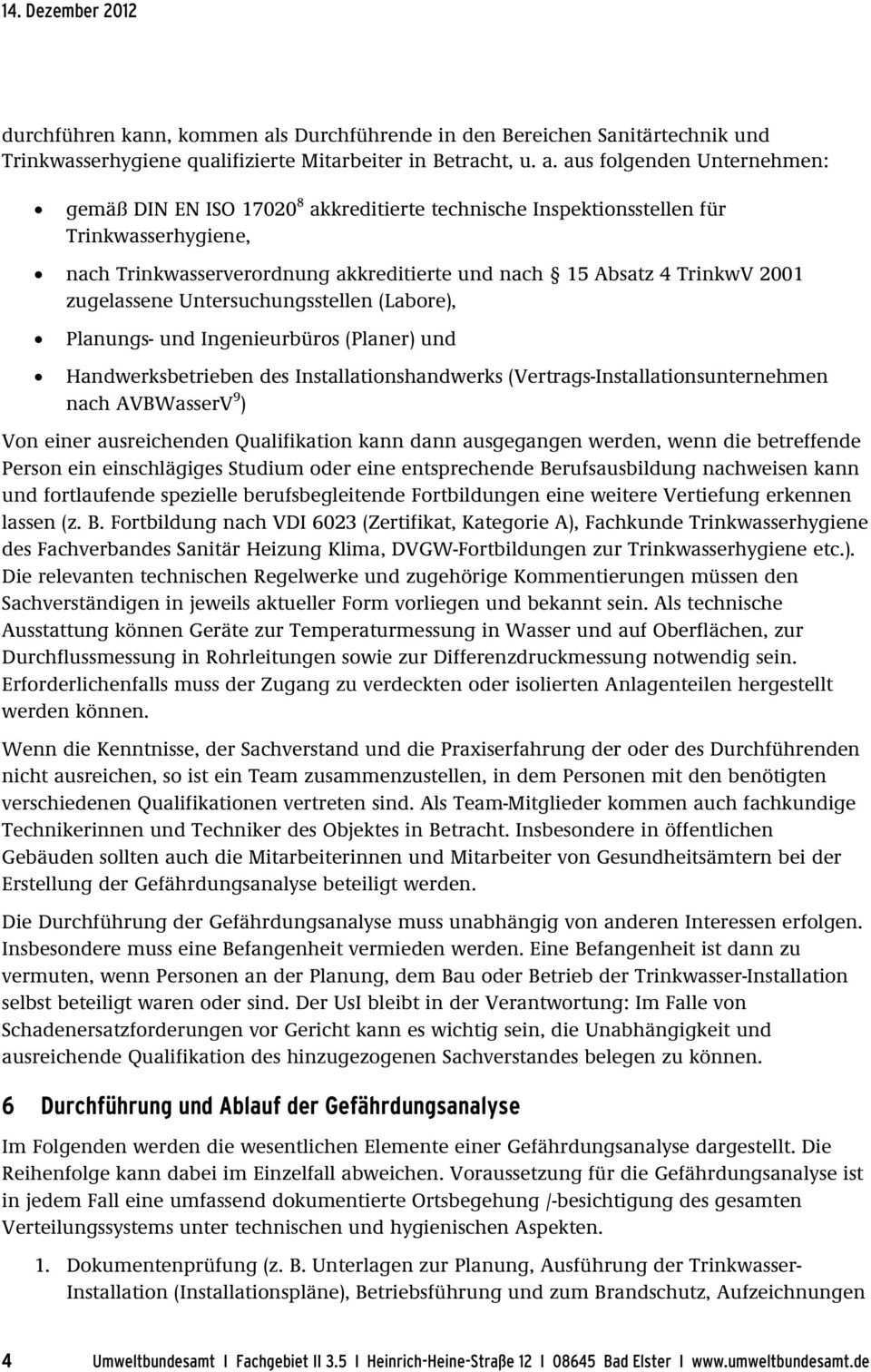 Feststellung ob die allgemein anerkannten regeln der technik eingehalten wurden und auflistung von mängeln 3. Fortbildung nach vdi 6023 zertifikat kategorie a fachkunde trinkwasserhygiene des fachverbandes. Gesamtbewertung der ergebnisse der gefährdungsanalyse 4.
