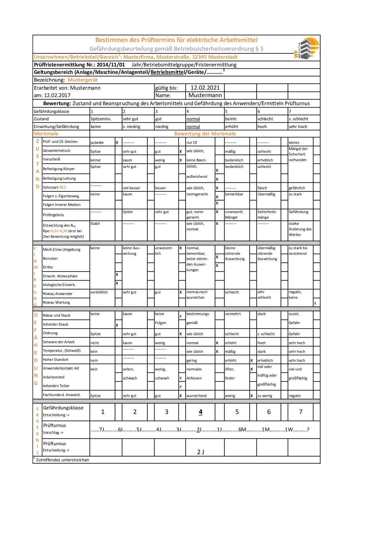 Gefaehrdungsbeurteilung betriebssicherheitsverordnung muster. Wie wahrscheinlich ist das räumliche und zeitlicher aufeinandertreffen von gefahr und tätigkeit und welche folgen können eintreten. Muster helfen bei der erstellung. Die vorliegende muster gefährdungsbeurteilung ist konzipiert für läger in denen ausschließlich in transportrechtlich zugelassenen gebinden gelagert wird passive lagerung wobei gefahrstoffe we der um noch abgefüllt werden und somit im normalbetrieb keine gefahrstoffe freigesetzt werden. Nach der betriebssicherheitsverordnung betrsichv muss die sicherheit an arbeitsmitteln regelmäßig durch eine gefährdungsbeurteilung überprüft und ggf.